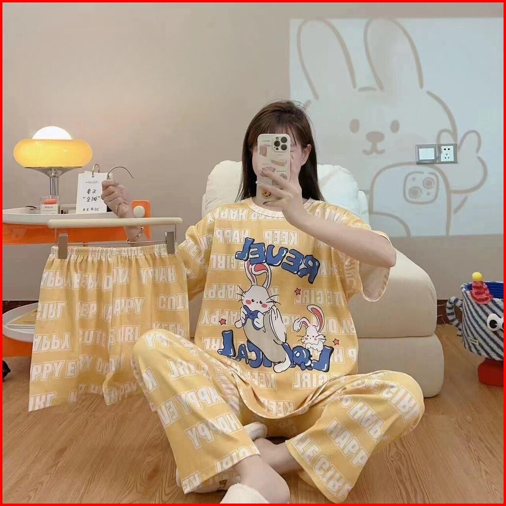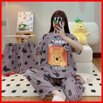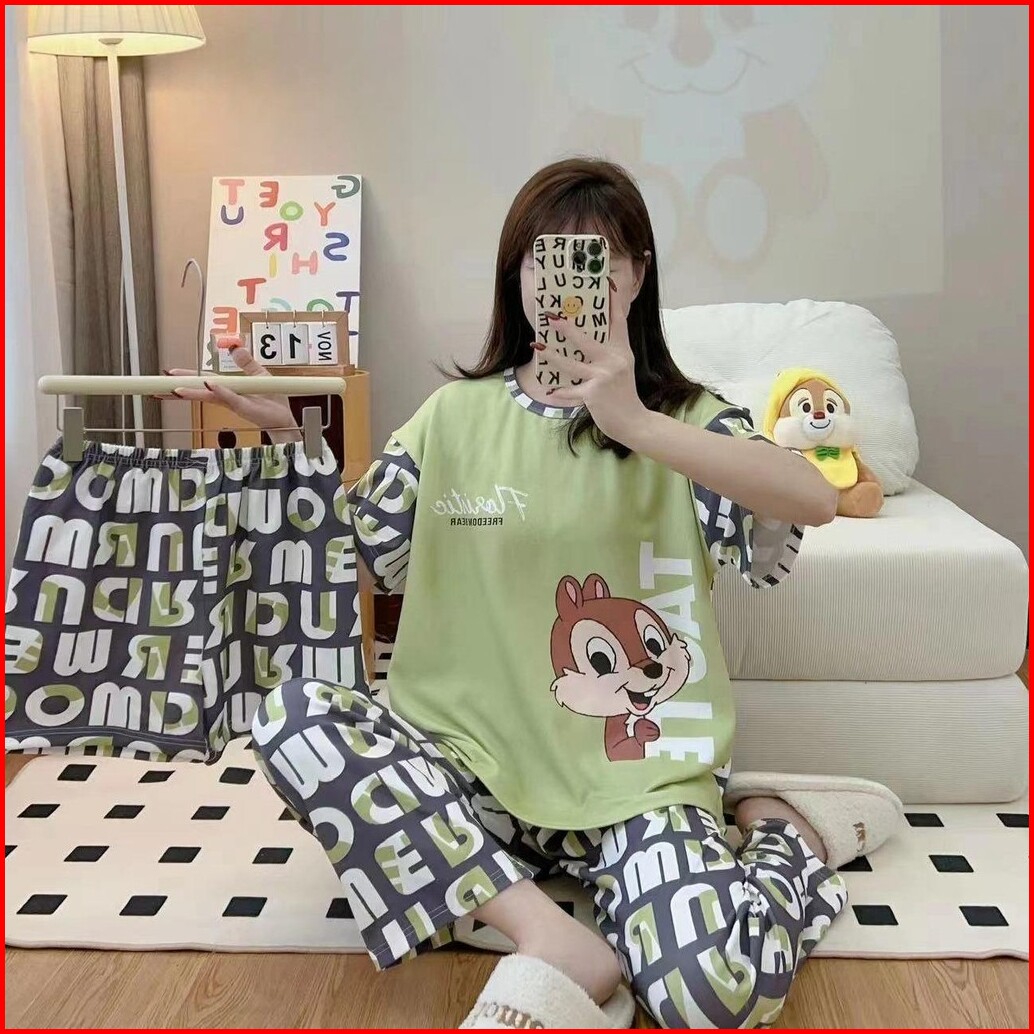 Jovan Setelan Wanita 3 In 1 Celana Panjang Celana Pendek Motif Print Baju Tidur Murah One Set Piyama