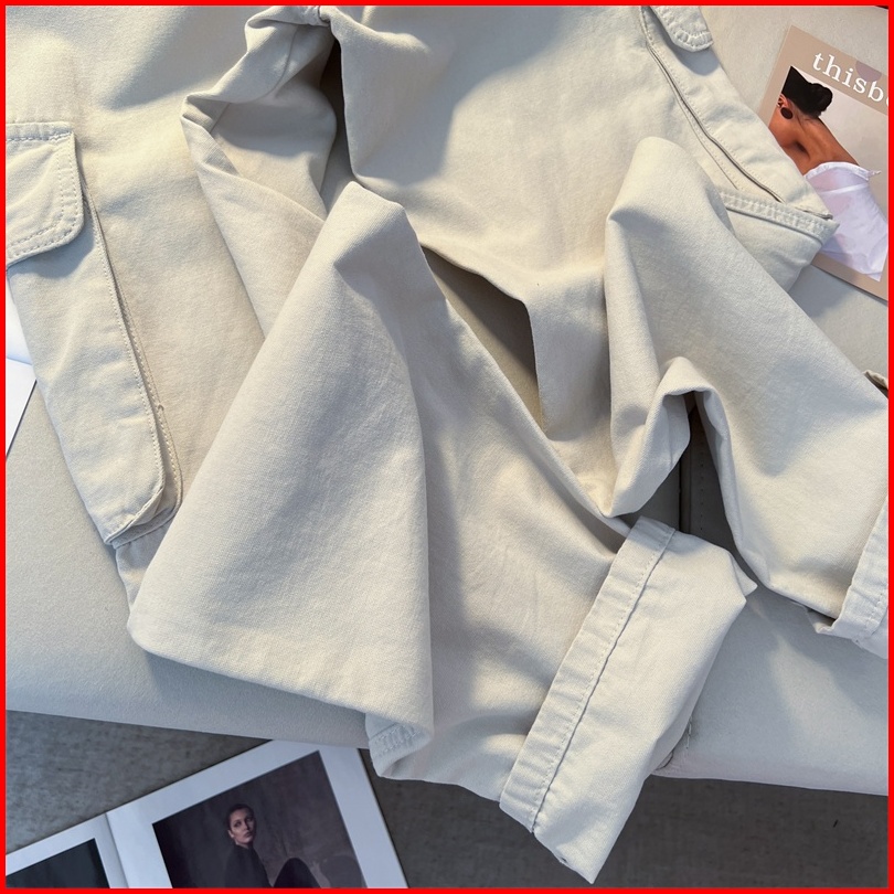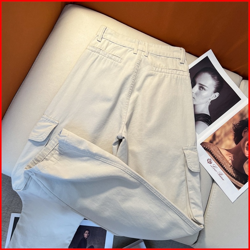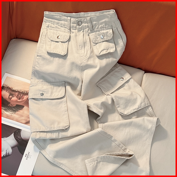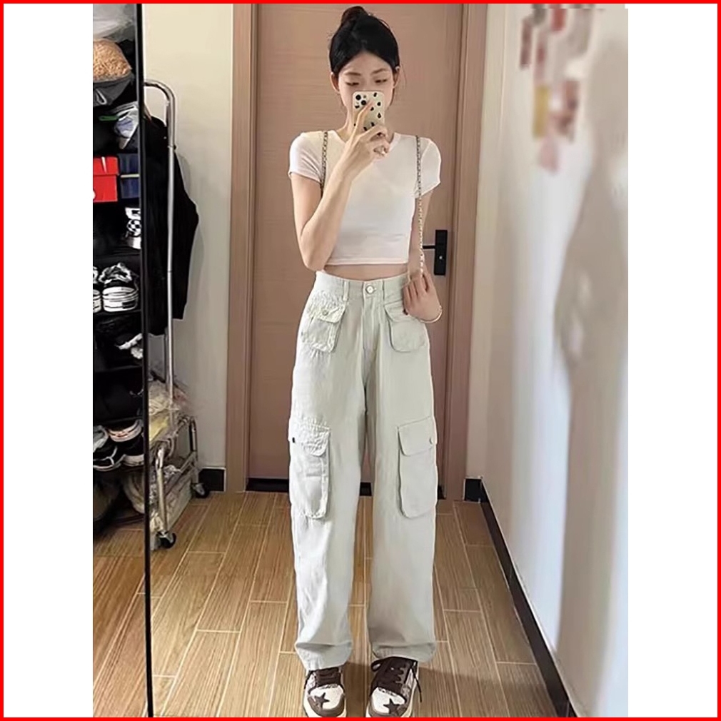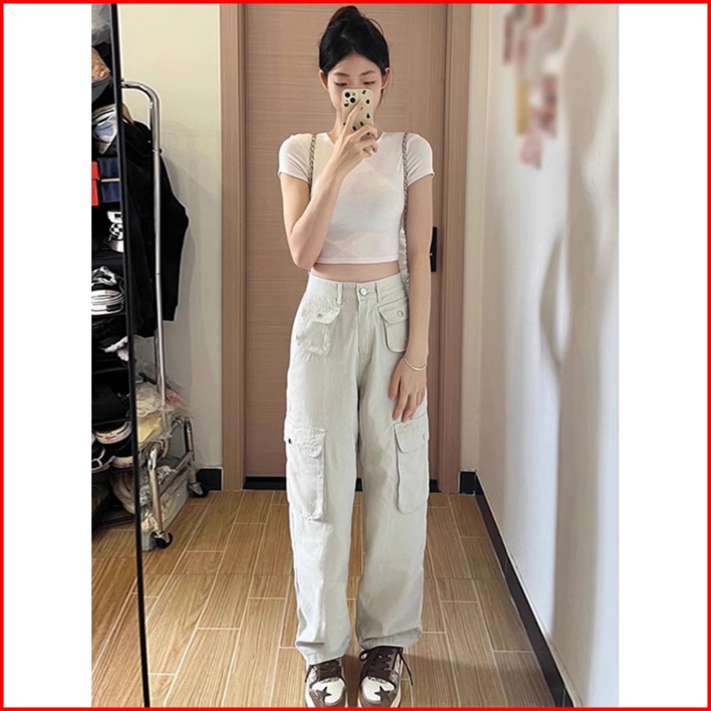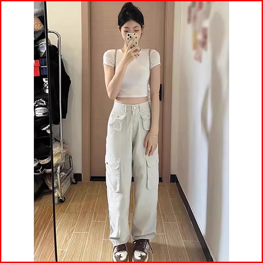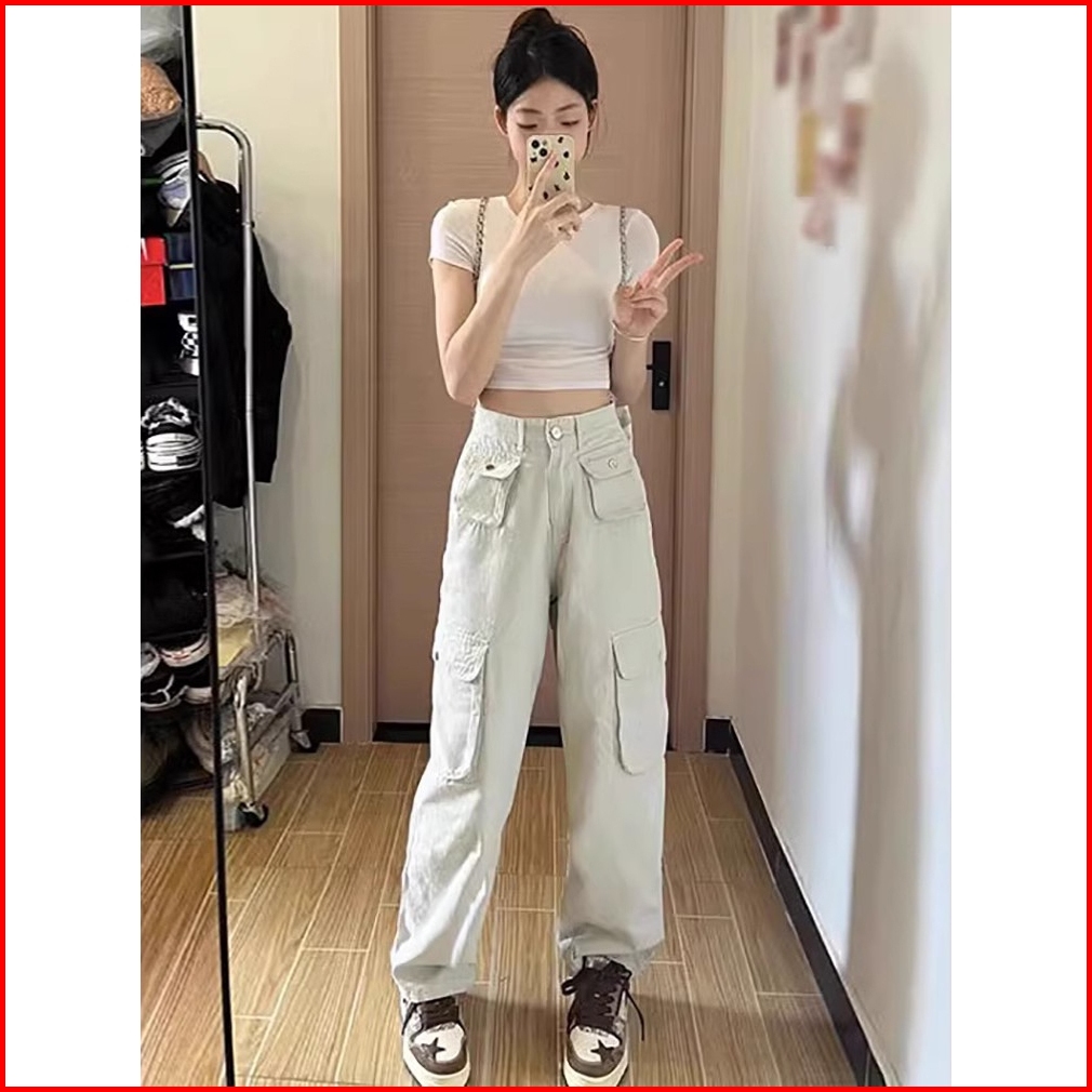 Po Floret Jeans Wanita High Waist Overall Putih Retro Amerika Kaki Lebar Yang Longgar Celana Jins Kasual Ramping