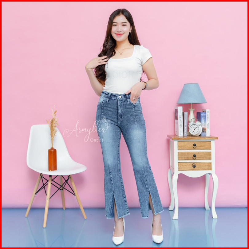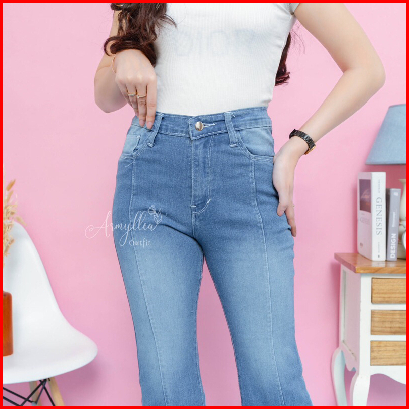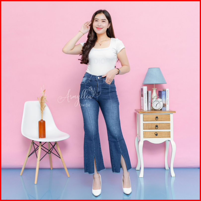 Celana Jeans Cutbray Wanita Highwaist Jeans Rawis Belah Tengah Stretch Mulur Size 27 - 34 Jumbo