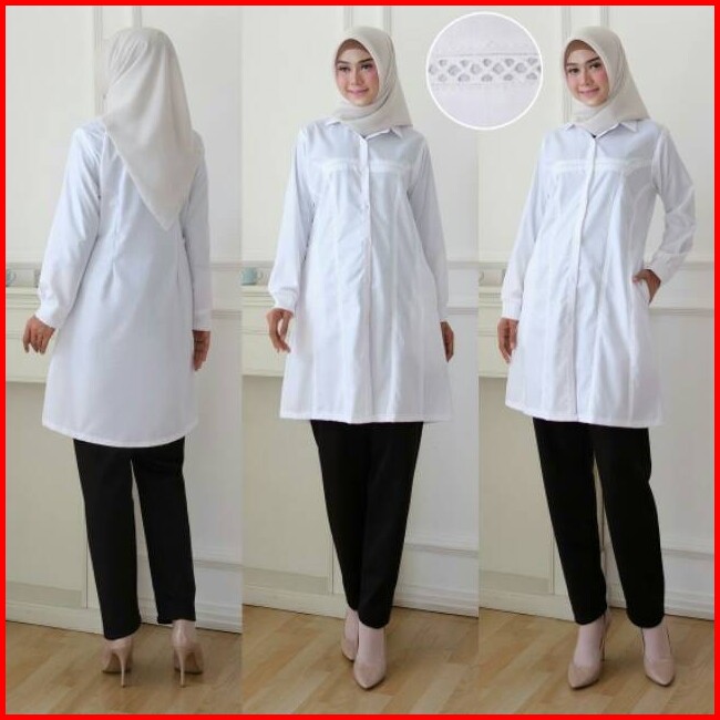Sakha - Kemeja Tunik Putih Wanita Atasan Kantor Guru Pns Seragam Lengan Panjang Bahan Katun Toyobo Fodu