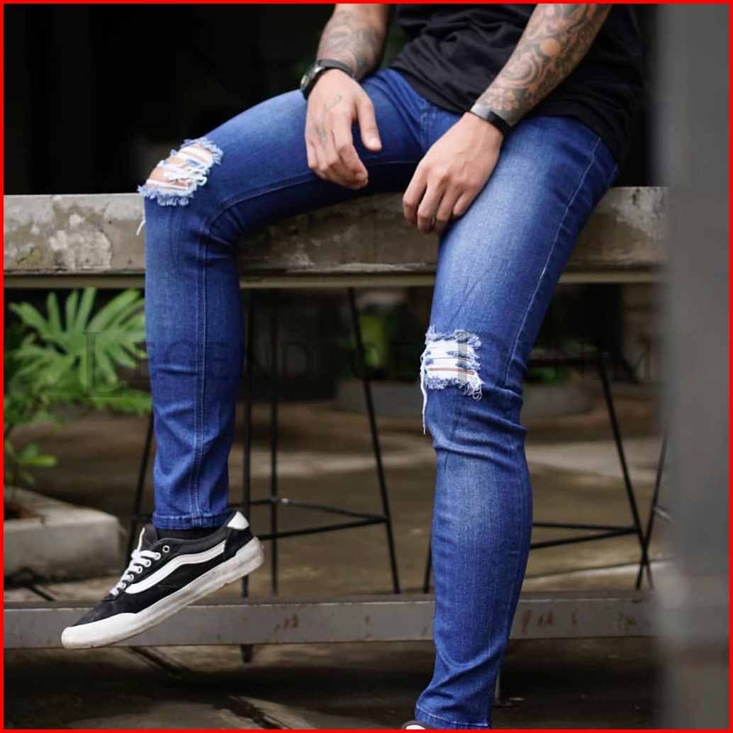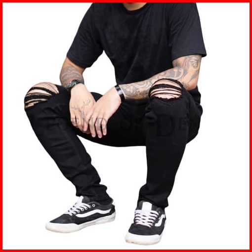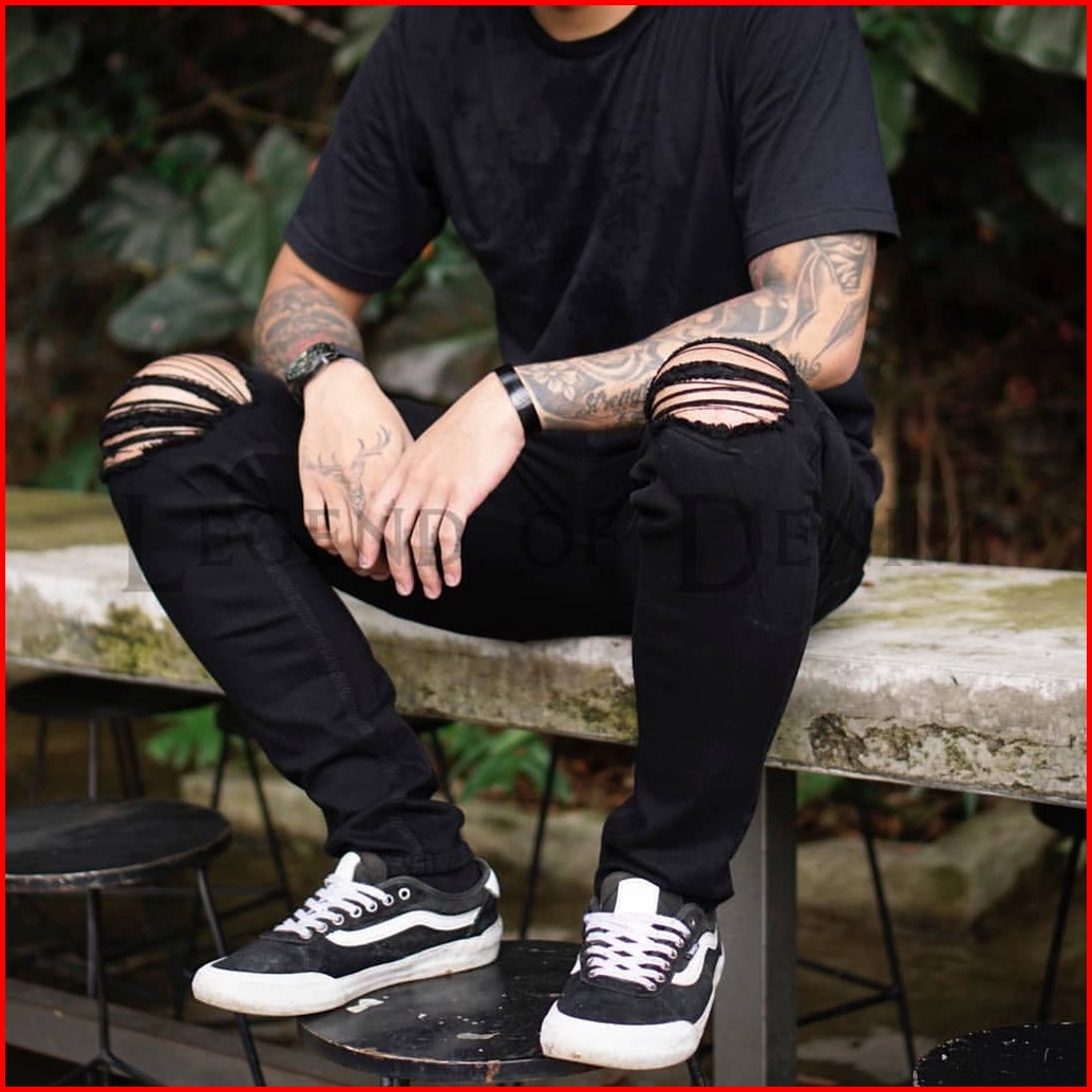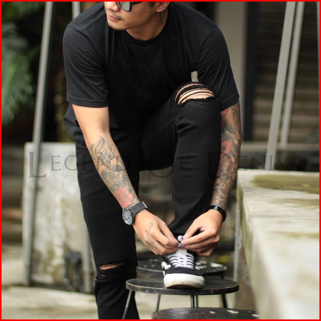 Celana Levis Pria Sobek Lutut Hitam Jeans Denim Strech Slimfit Cowo Jins Pensil Sobek Lepis Cowok Skinny