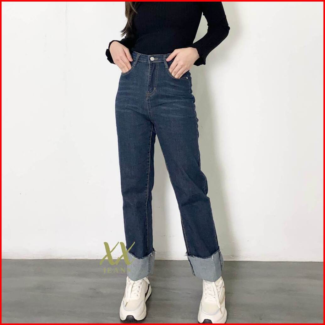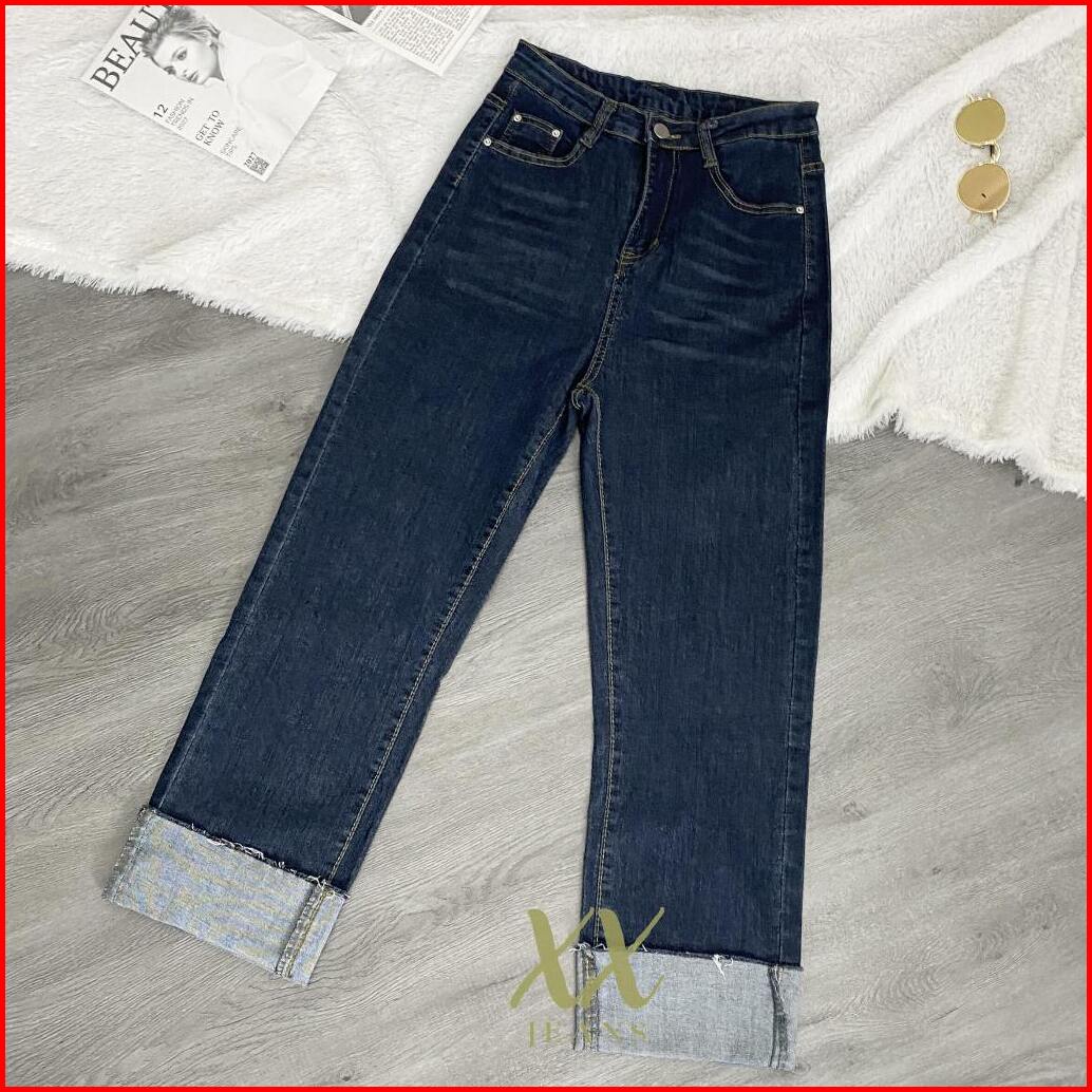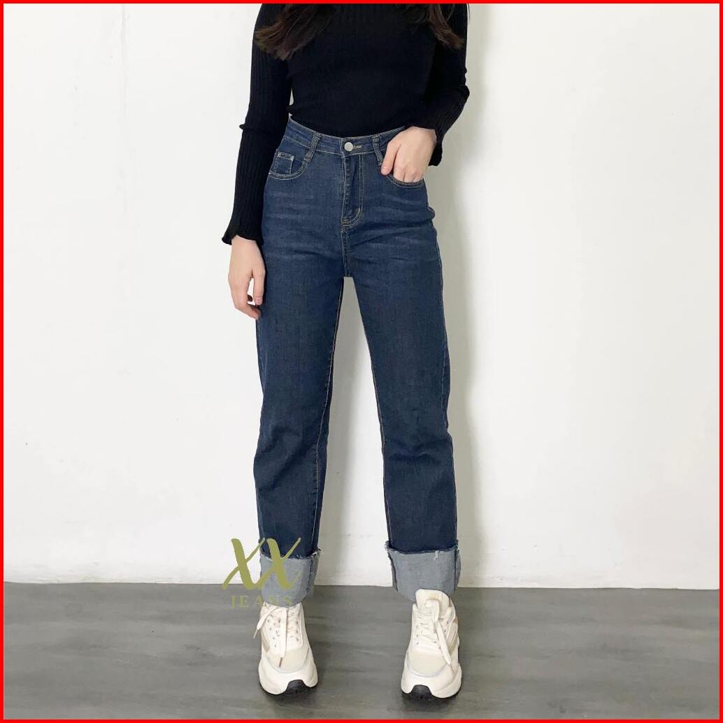 C4 - Celana Panjang High Waist Jeans Kulot Lipat Biru Tua Wanita Korean Style Premium Import