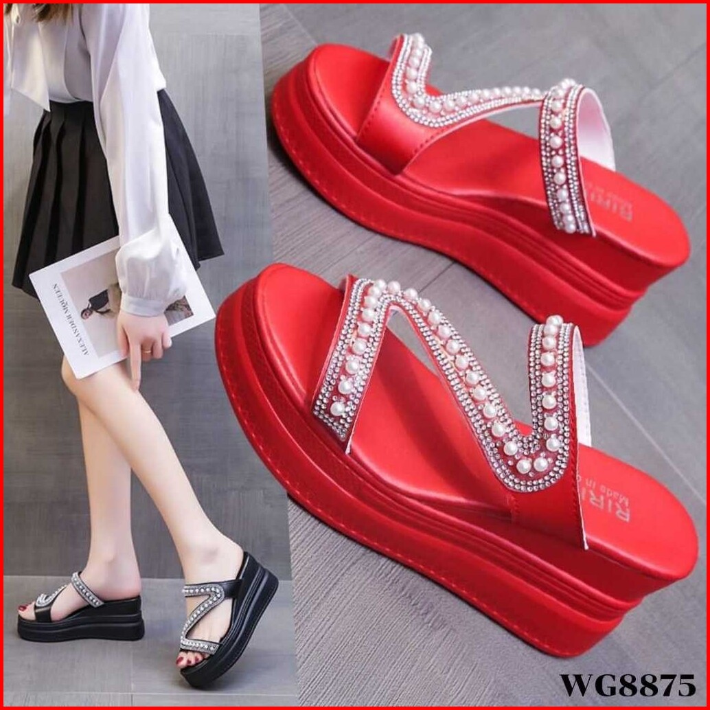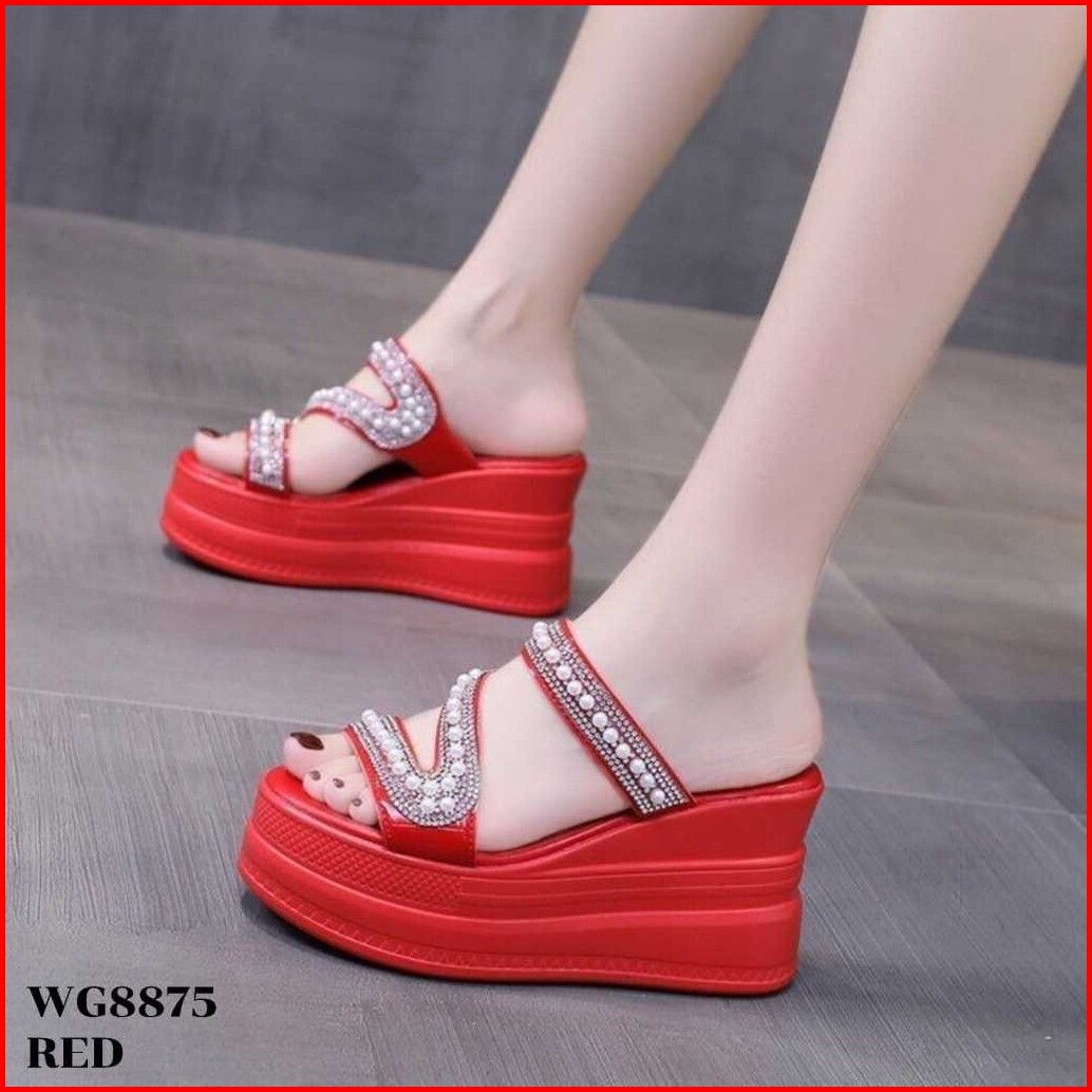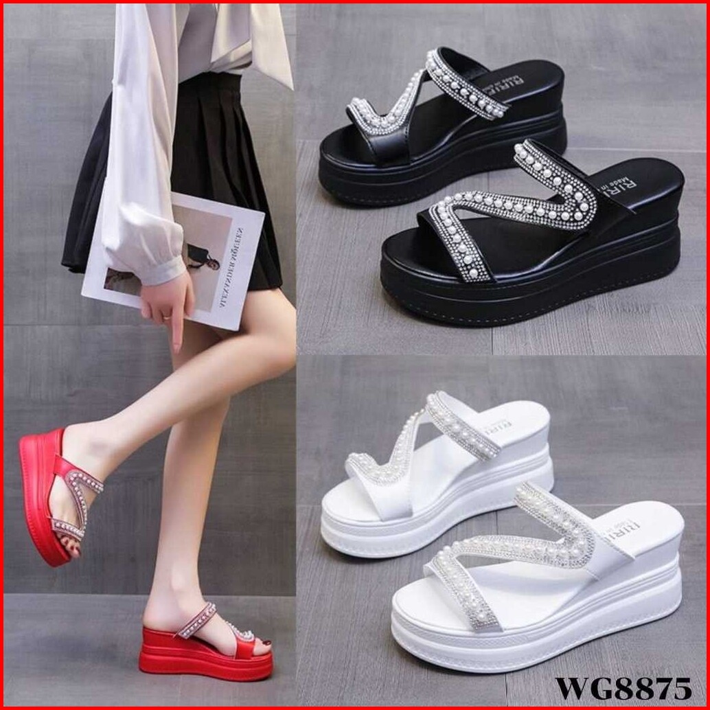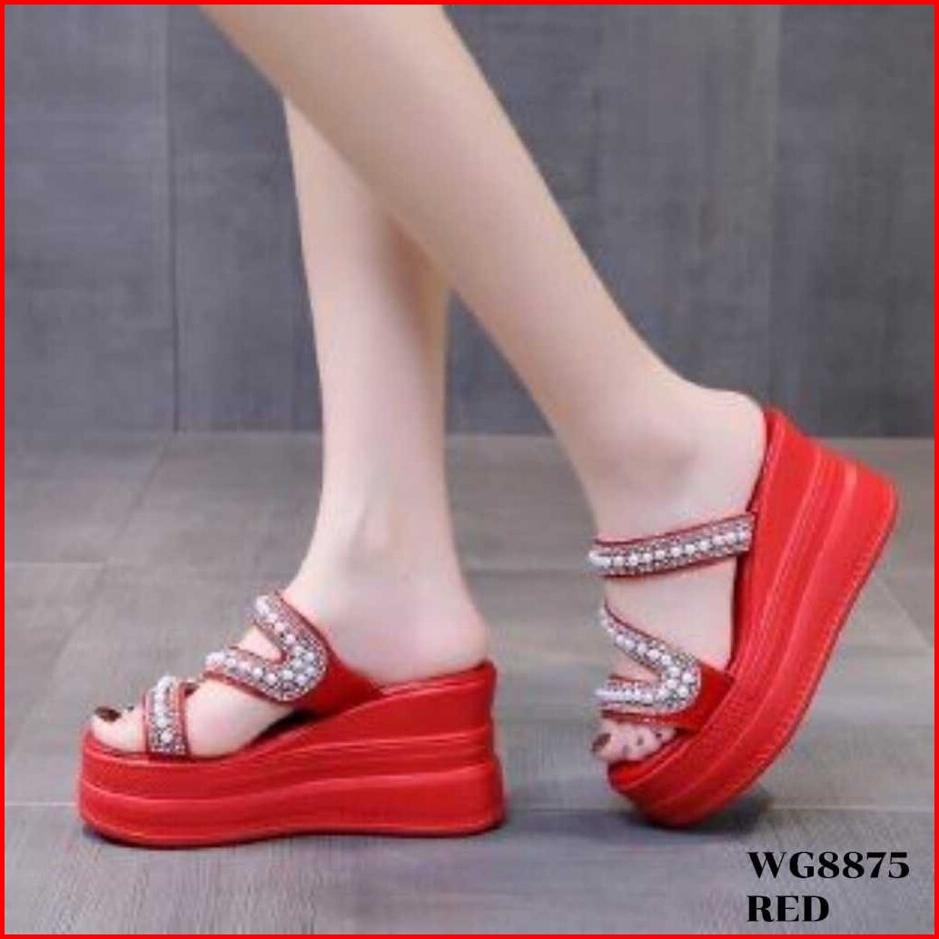 Prf Sandal Wedges Highsole Tinggi 7.5cm Red Black White Korea Shoes Pearls Design Bahan Sintetis Wg8875