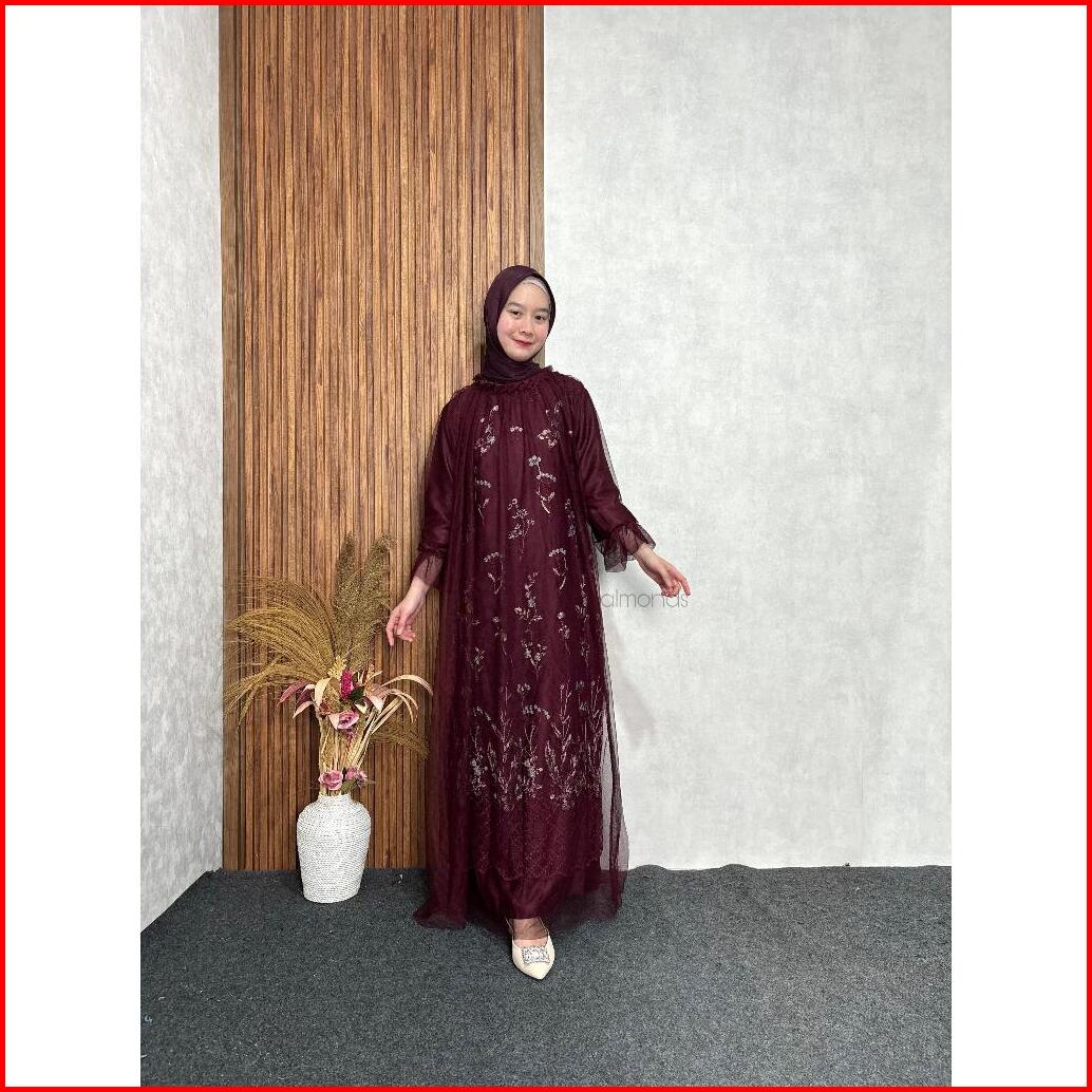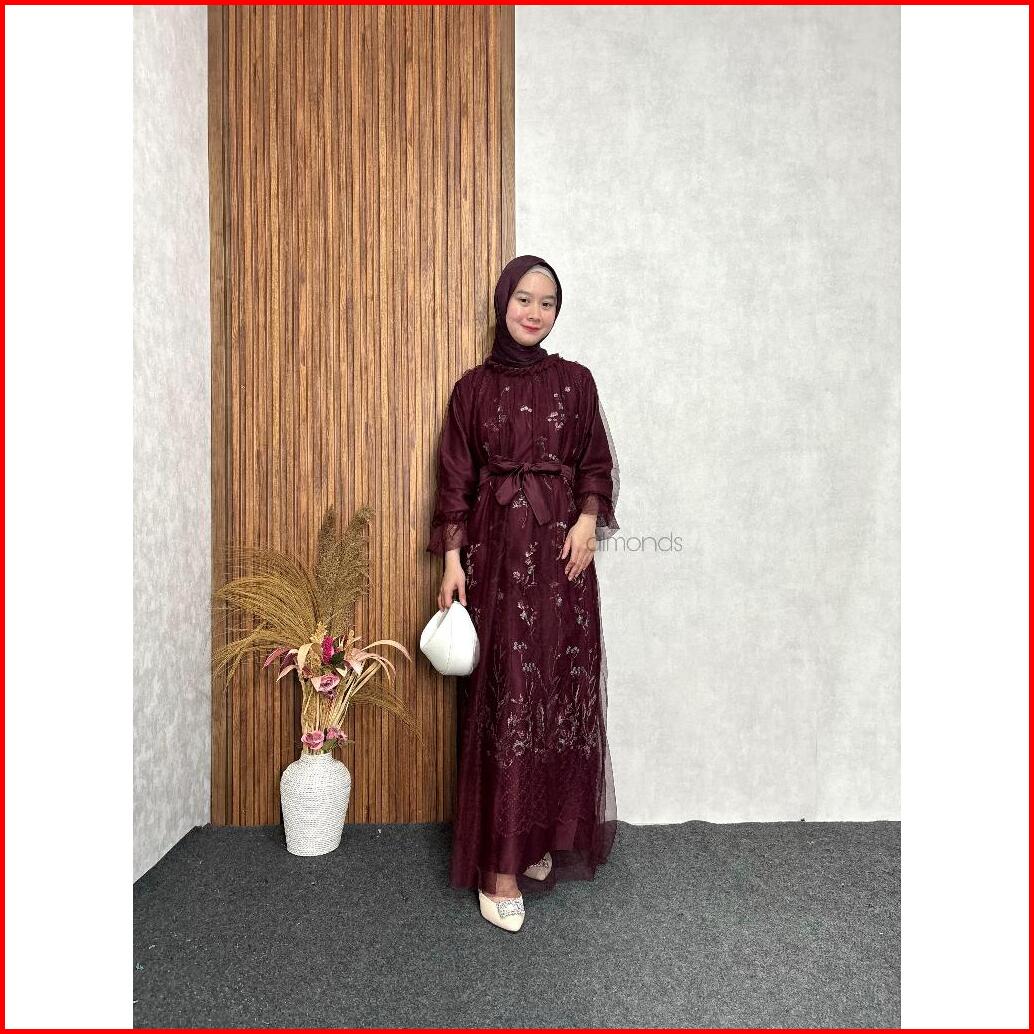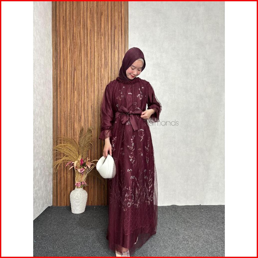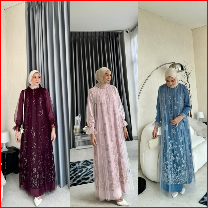 New Rivani Dress Brukat Tile Garden Motif Mix Tulle Gamis Kondangan Bridesmaid M L Xl Xxl