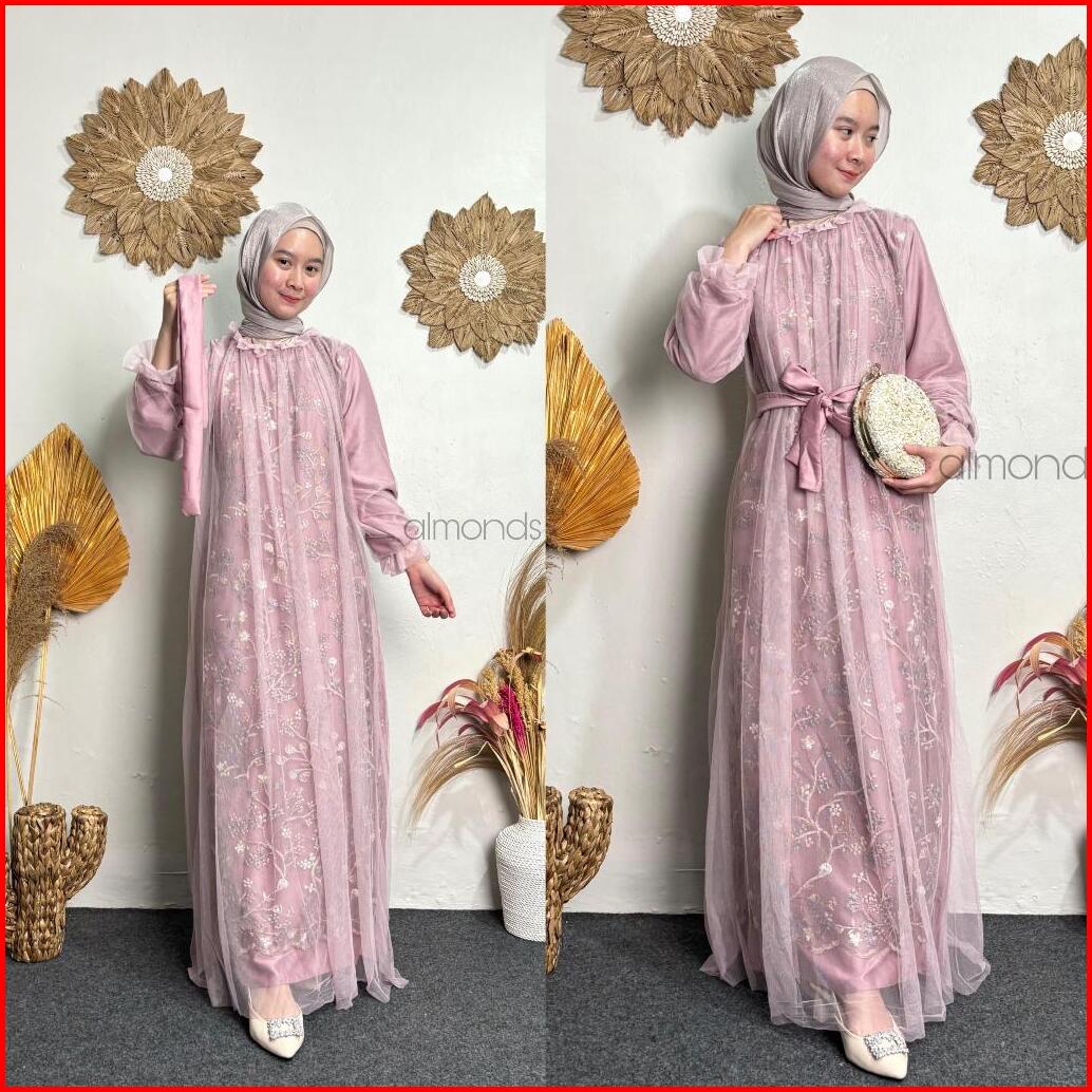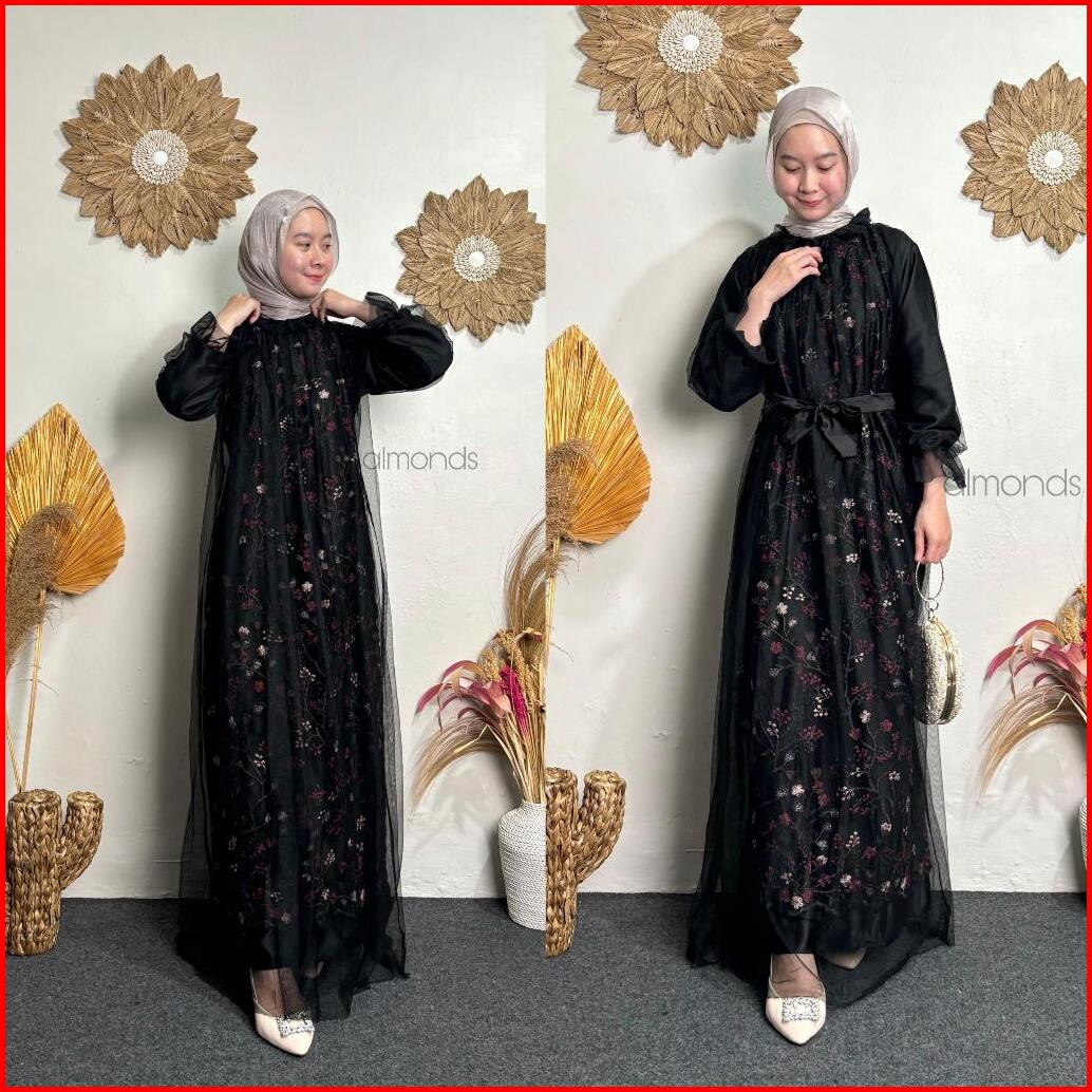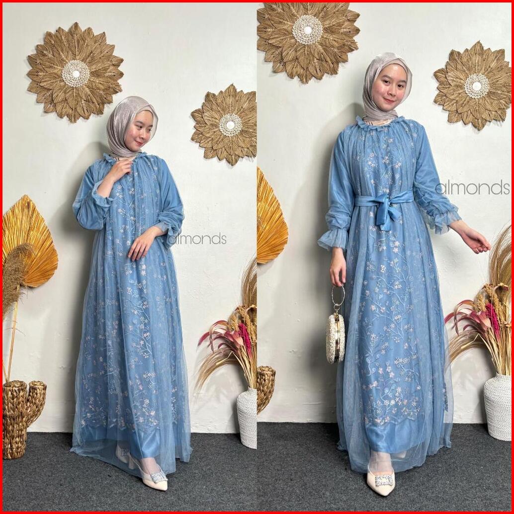 New Rivani Dress Brukat Tile Garden Motif Mix Tulle Gamis Kondangan Bridesmaid M L Xl Xxl