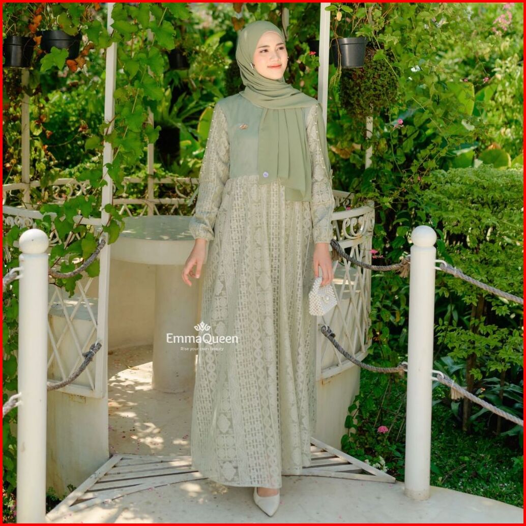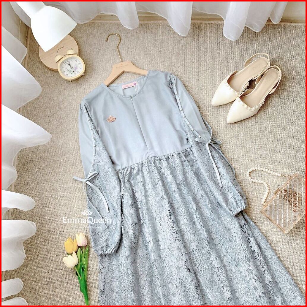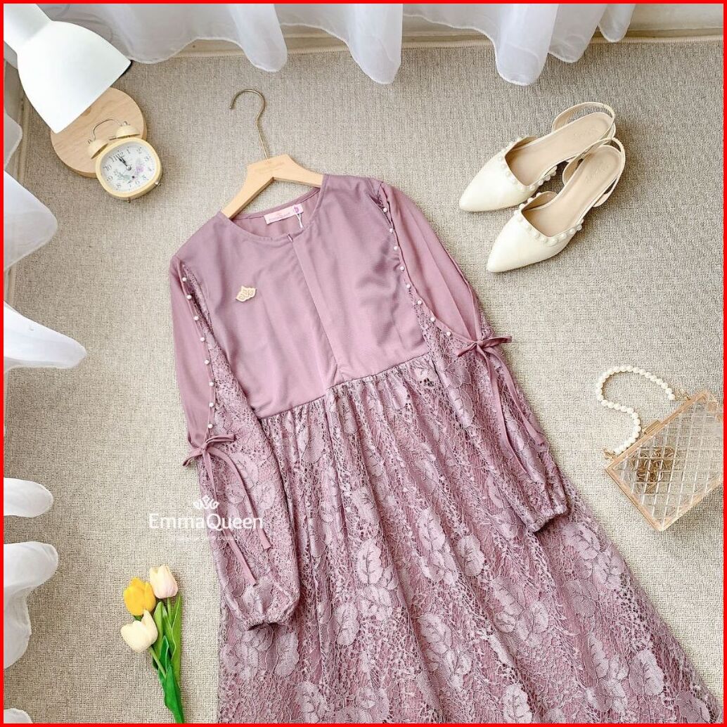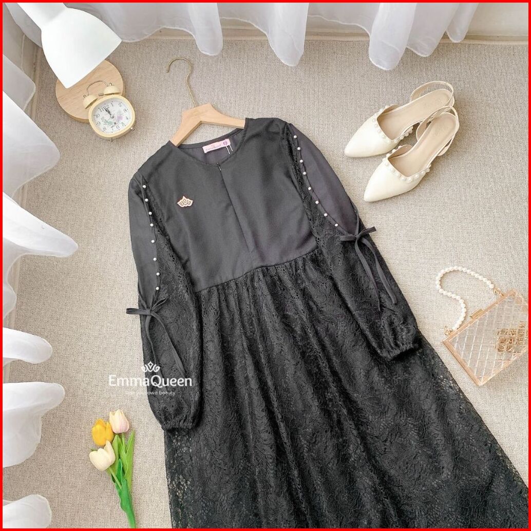 Emmaqueen - Dress Elaina Gamis Pesta Mewah Elegan Simple Katun Brukat Kombinasi Tile Xs Xxl Busui
