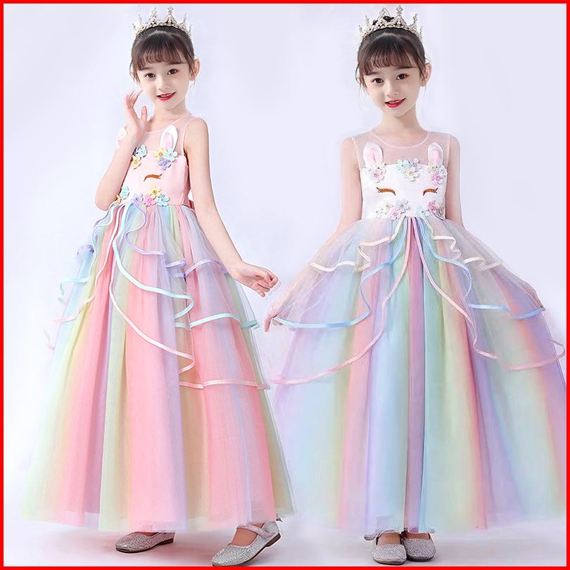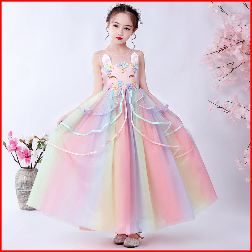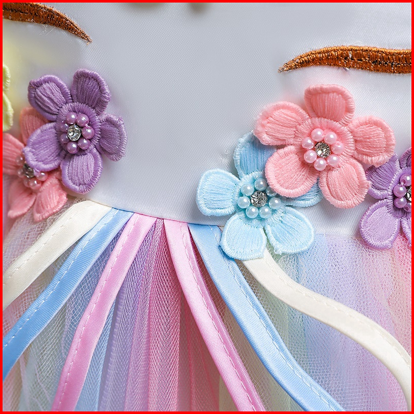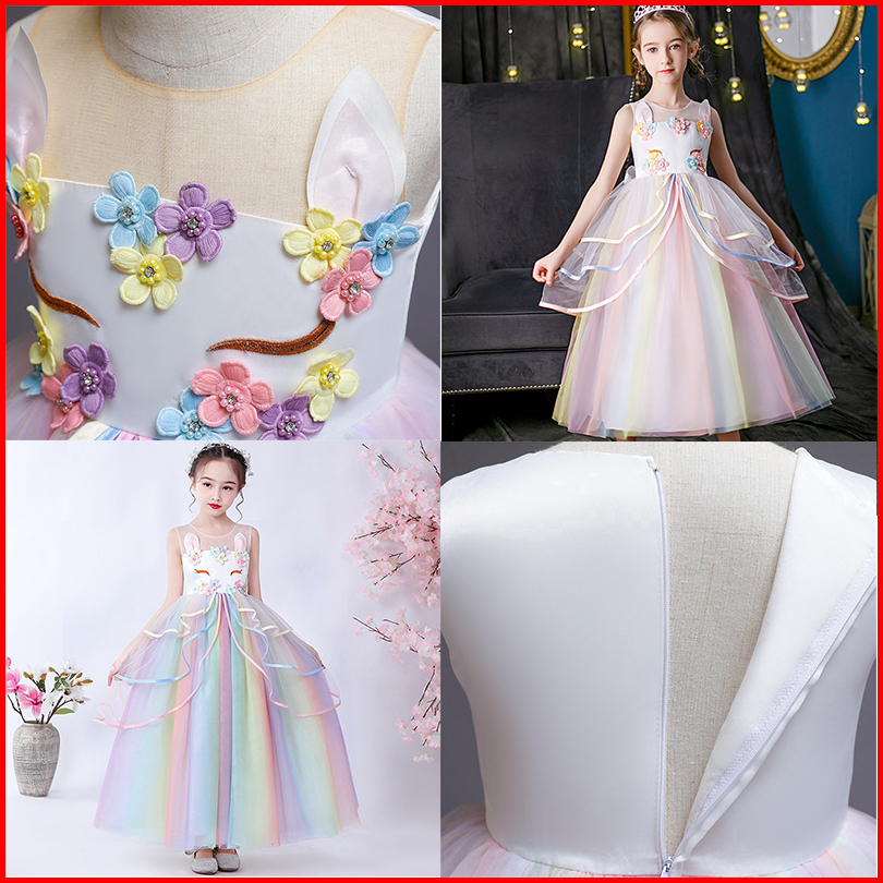 Anak-anak Kostum Halloween Gadis Bunga Unicorn Gaun Panjang Gaun Tanpa Lengan Bordiran Hiasan Renda Gaun