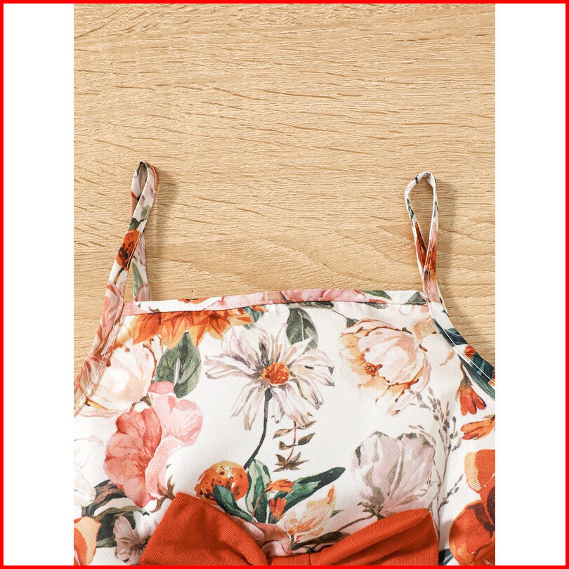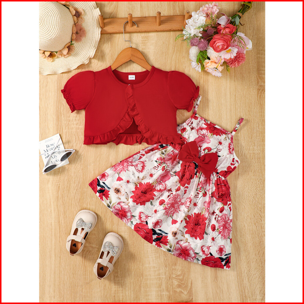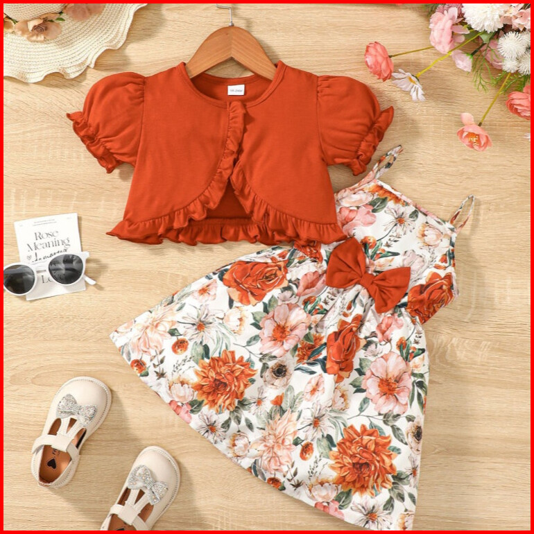 Haasya Kids 1-6 Years Dress For Kid Girl Chlid 2pcs Clothes Set Plain Color Short Sleeve Top With Floral Sleeveless Dres