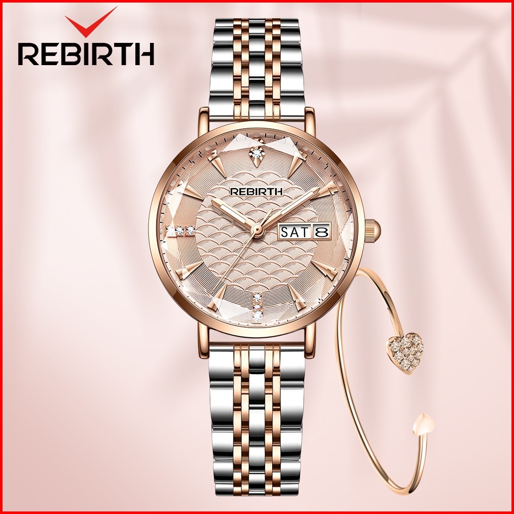 Rebirth Jam Tangan Wanita Tampilan Kalender Ganda Mode Bisnis Ganda Anti Air Kuarsa Tali Stainless Steel Jam Tangan Cewe