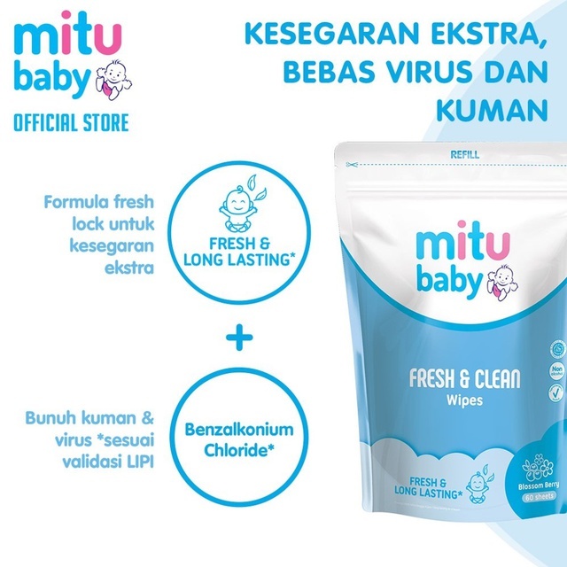 Mitu Baby Fresh & Clean Blossom Berry Pink Chery Bottle / Refill 60'S - Tisu Basah Bayi - Baby Pllaza