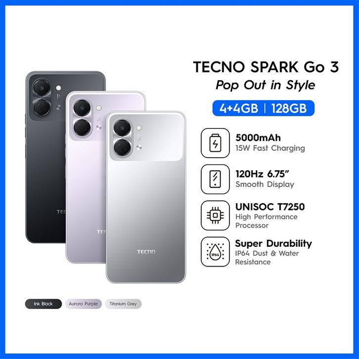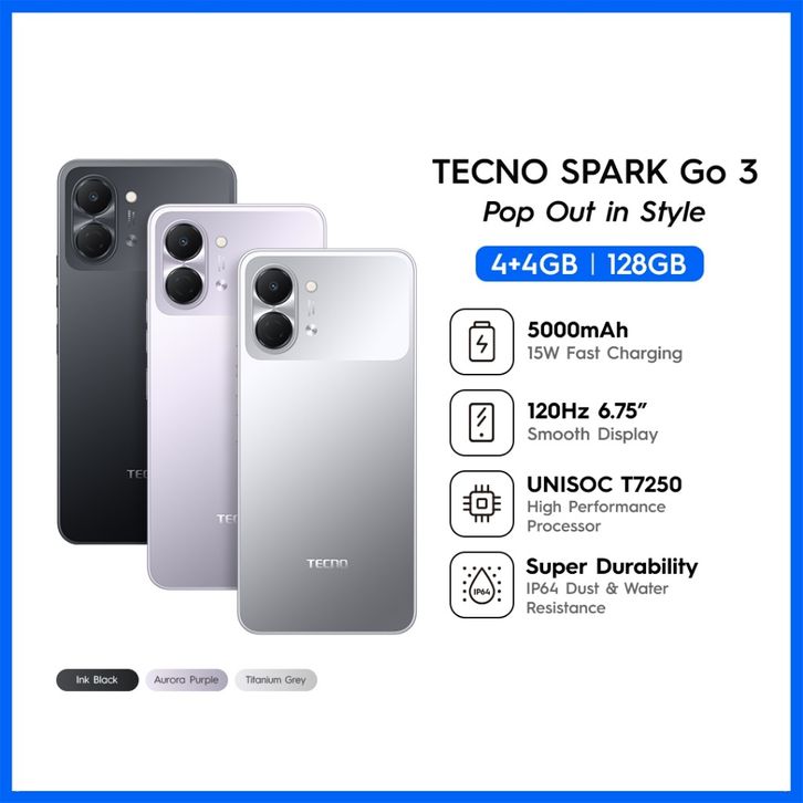 TECNO SPARK GO 3 4GB+4GB/128GB 6.75" HD+ 5000MAH 15W CHARGING HP TECNO AI SPARKGO3 ORIGINAL