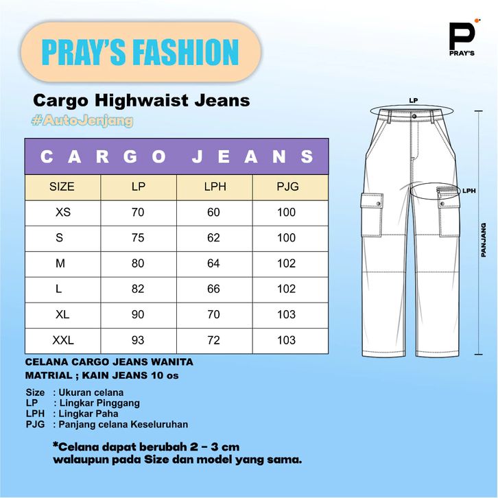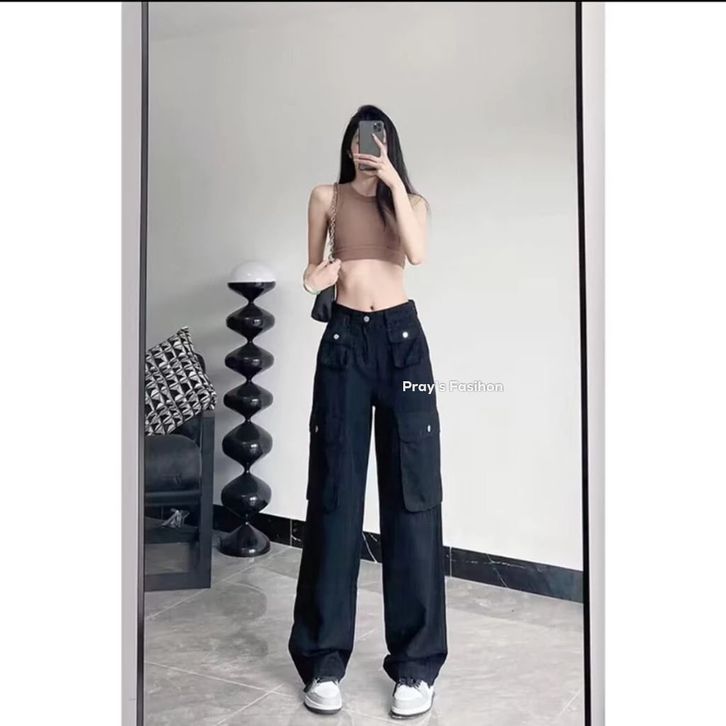 Prays Fashion - Cargo Denim Pasir Putih Highwaist Loose Celana Jeans Wanita Korea(realpict)