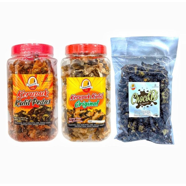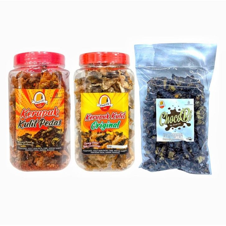 PAKET KERIPIK KULIT IKAN 3 PCS NAGE 20 KERIPIK KULIT IKAN PEDAS MANJE TOPLES,KULIT IKAN ORIGINAL, 500G CHOCOBI