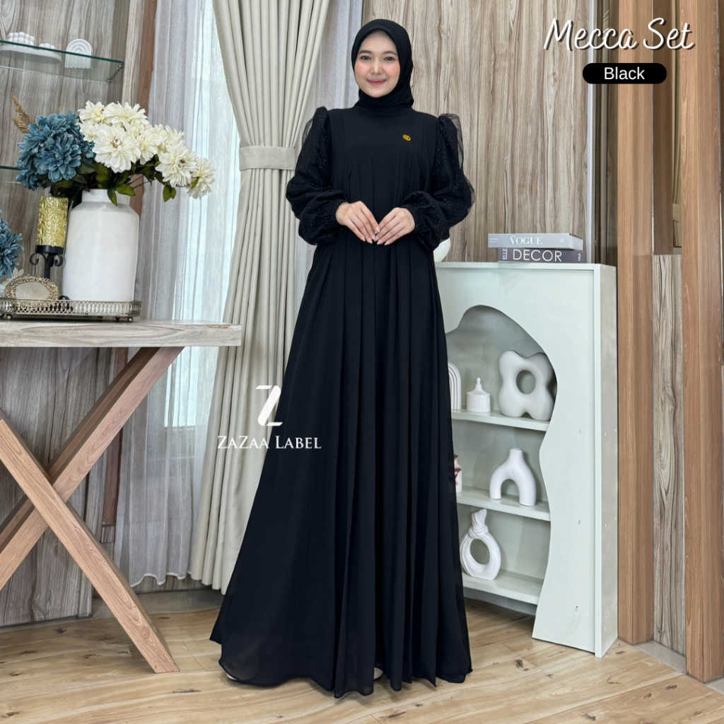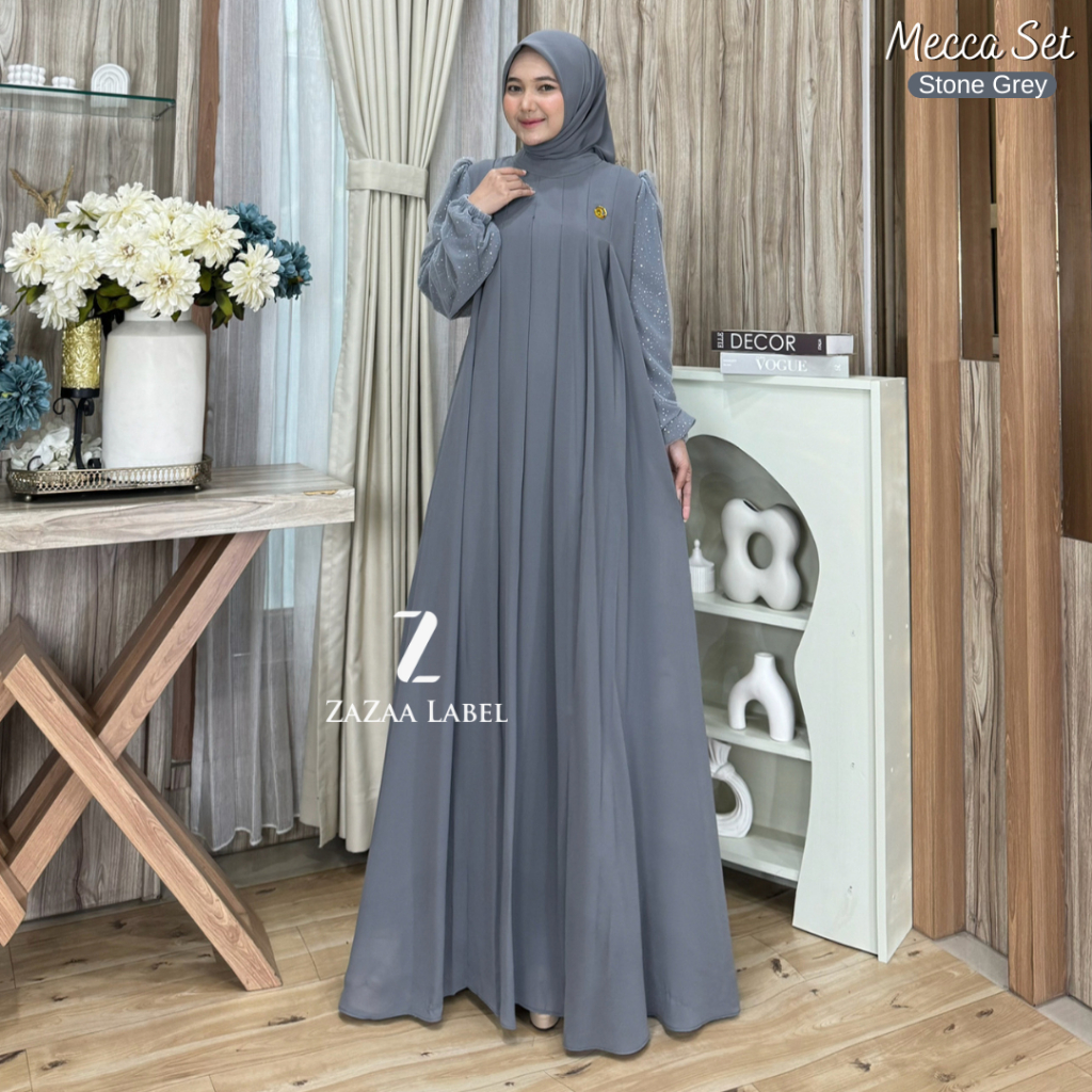 New Mecca Set Gamis Jumbo Hijab Motif Polos Bahan Ceruty babydoll (full furing) kombinasi tile gliter sparkling NonBusui