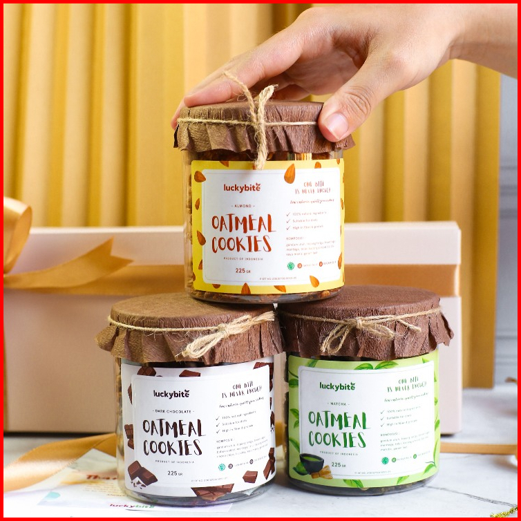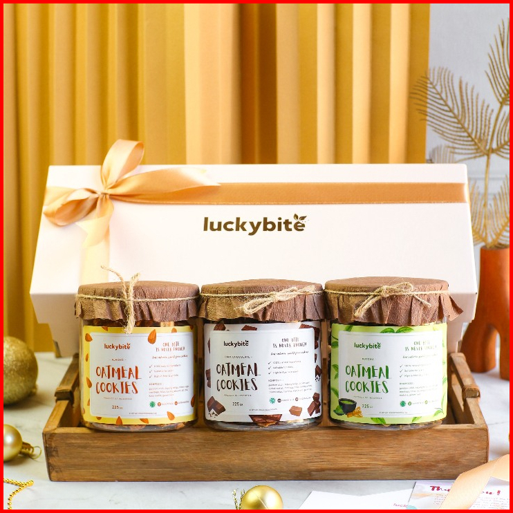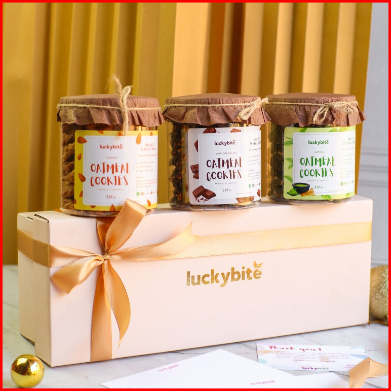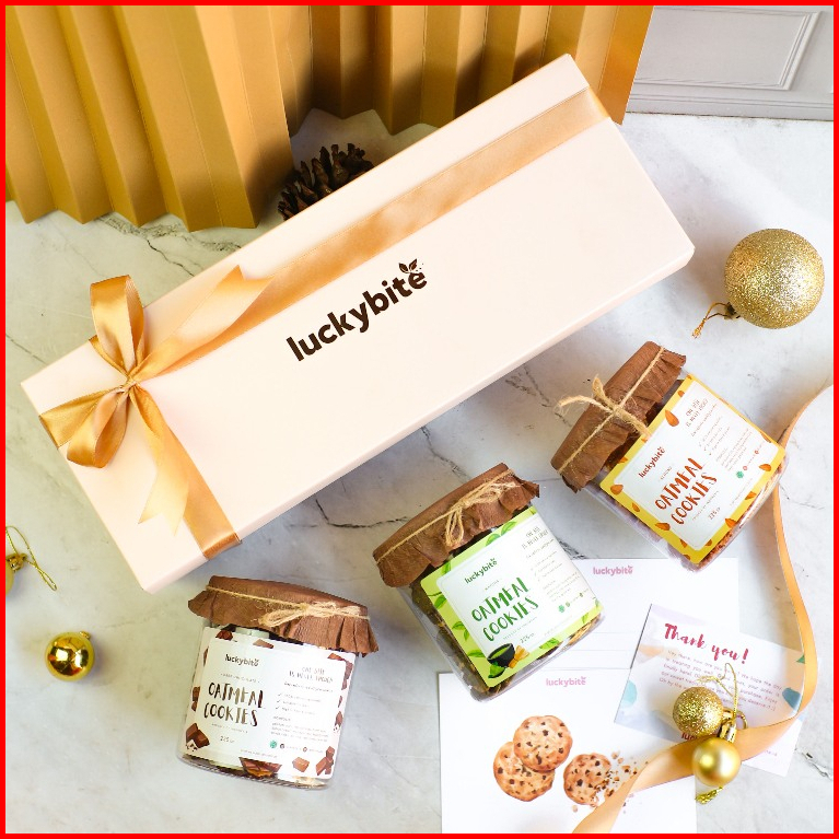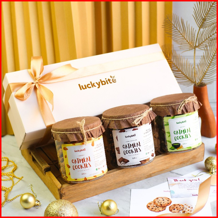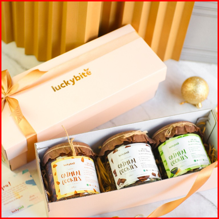 Hampers Gift Box Kado - Semi Hardbox - Oatmeal Cookies 3 Jar Free Greeting Card Pita Bubble Wrap Luckybite