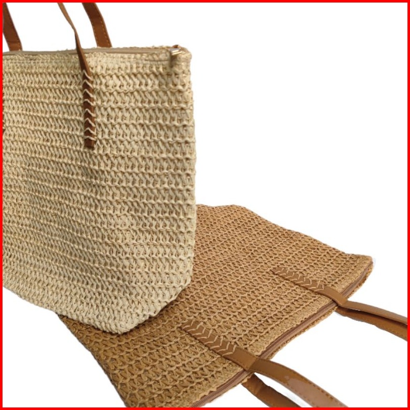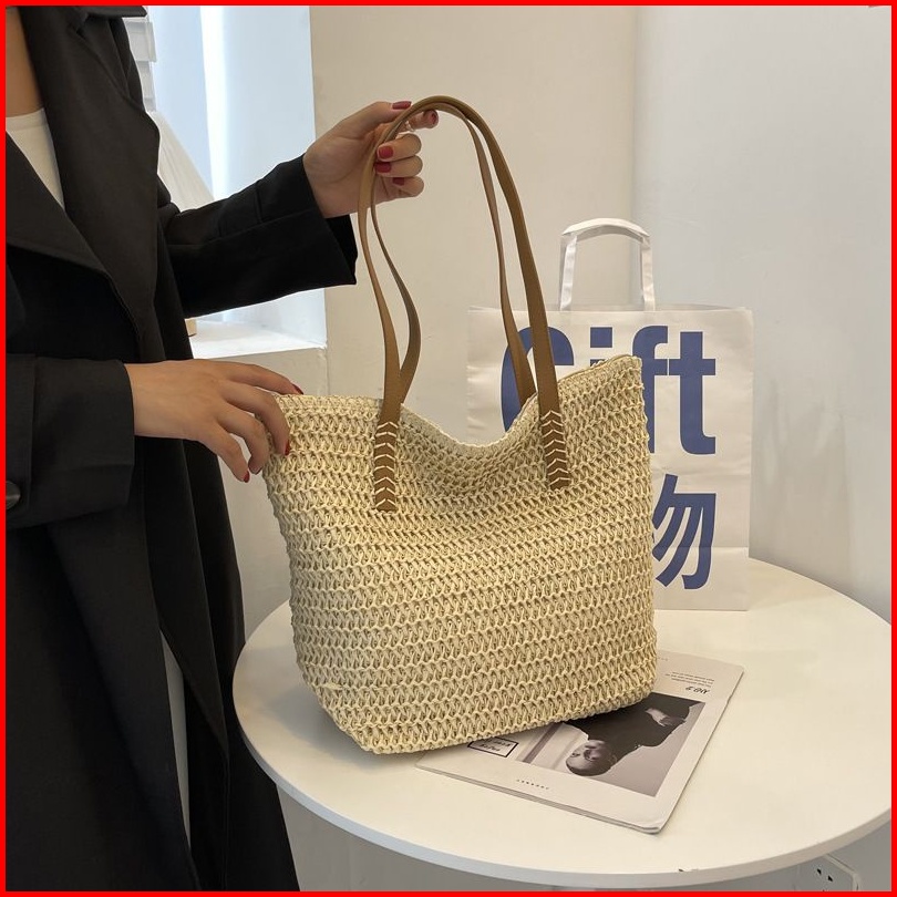 Tas Wanita Anyam Jerami Tw208 Woman Large Straw Woven Tote Bag With Leather Straps Bohemian Style