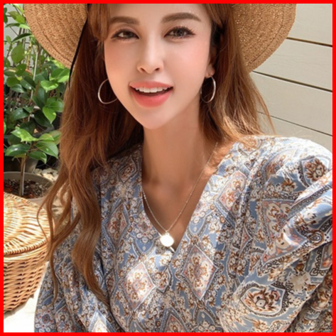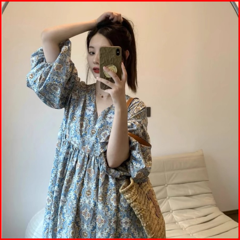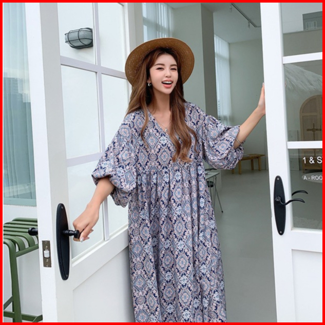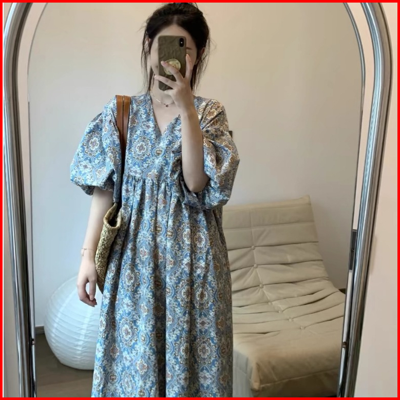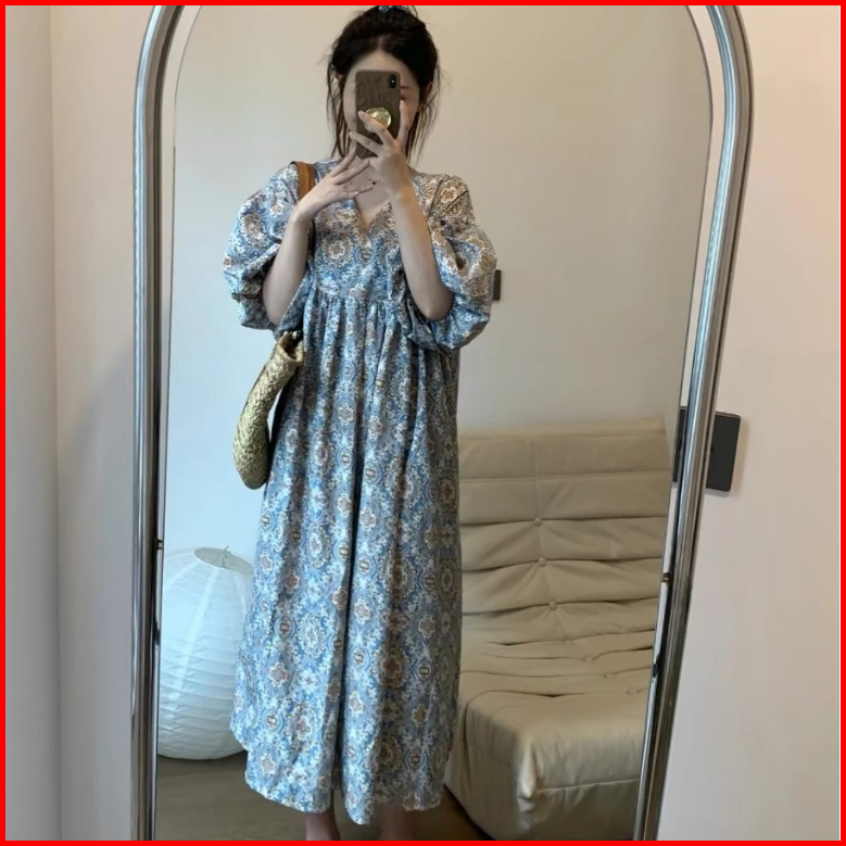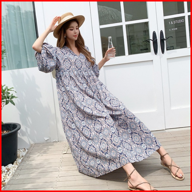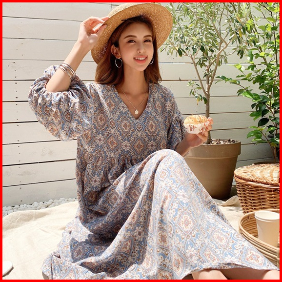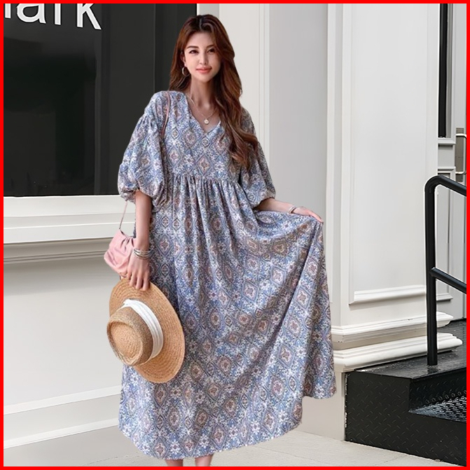 Dress Swing Dress Gaun Bohemian Gaun Retro Prancis Gaun Lengan Lentera Tercetak Rok Pantai Gaun Wisata Gaun Gaya Etnis V