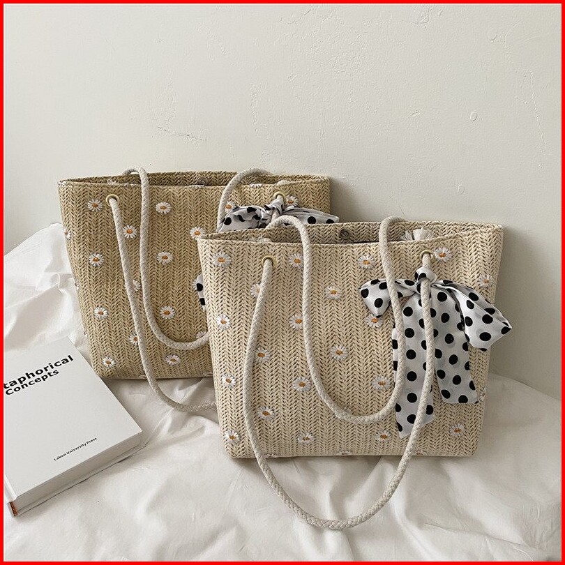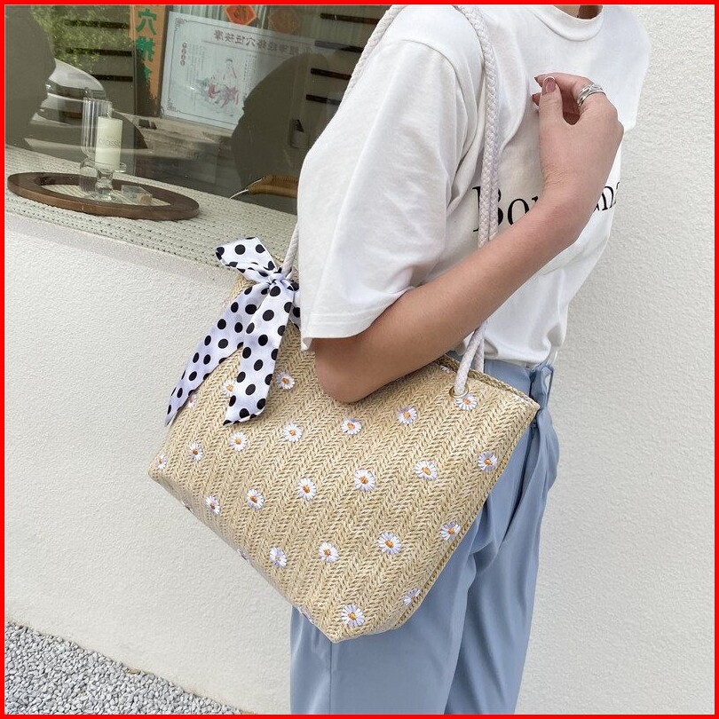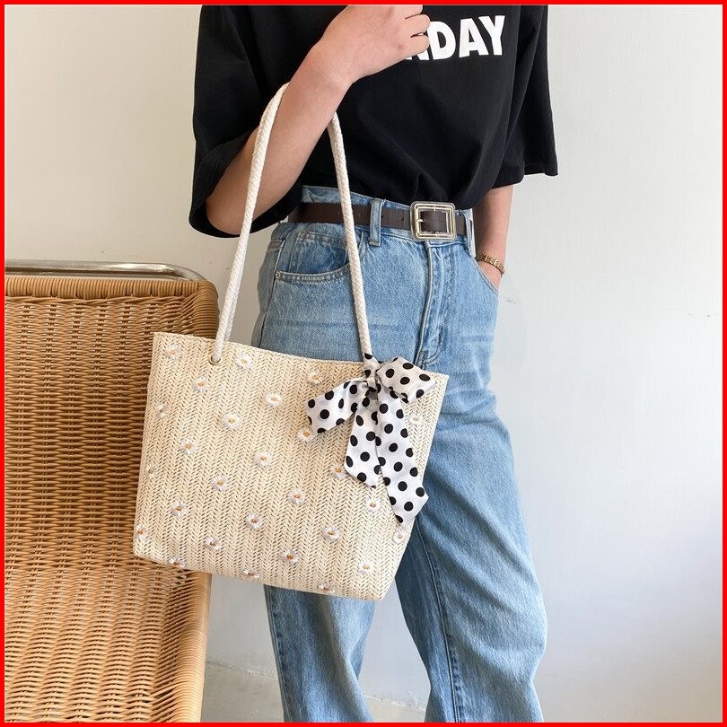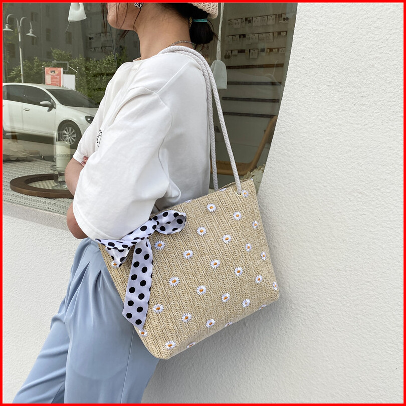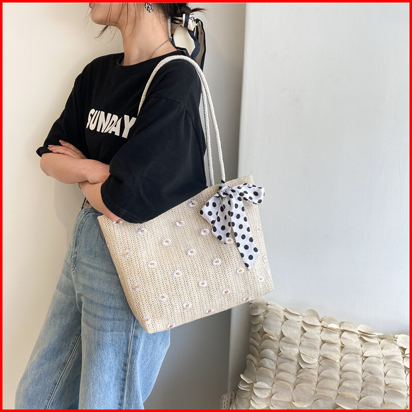 Tas Bahu Wanita Rajut Modis Tote Bag Pantai Anyaman Pita Besar Segar Sederhana Bunga Dmts009