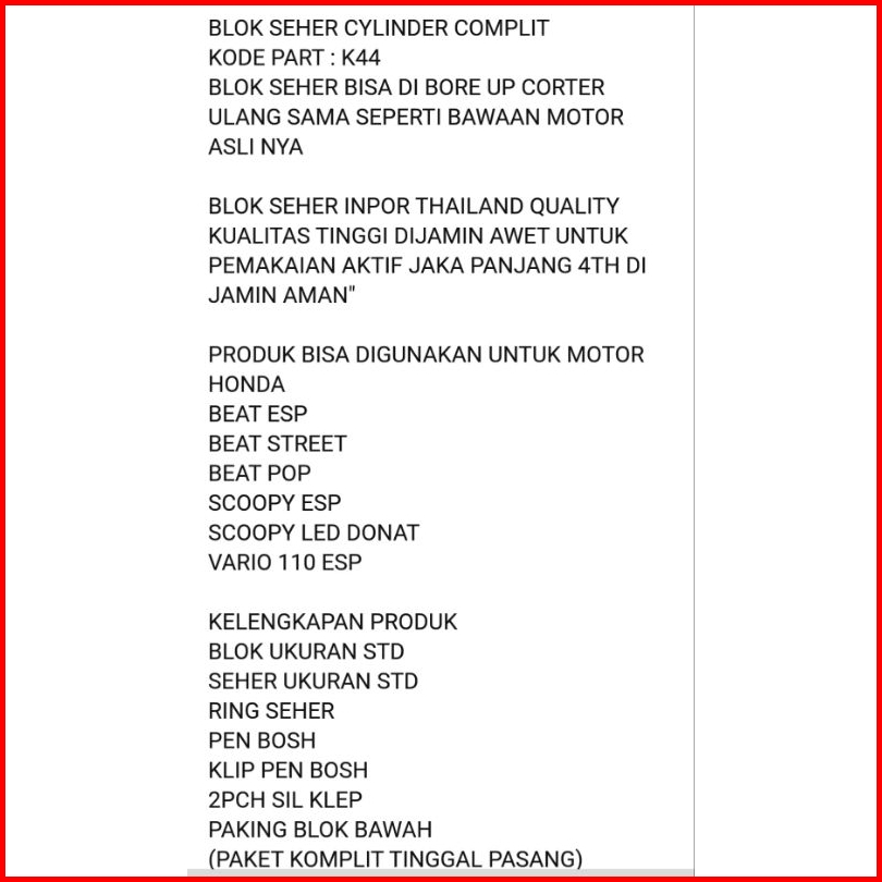 Blok Seher Cylinder Complit K44 Beat Esp Scoopy Esp Beat Pop Beat Street Vario 110 Esp Led - Thailand Quality