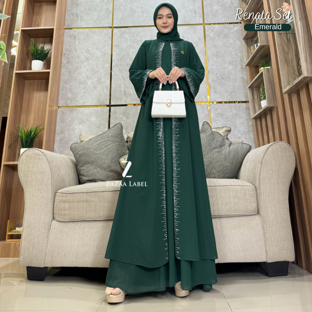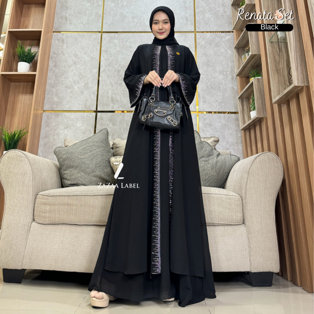 BEST SELLER - Renata Set Gamis Hijab Motif Polos Bahan Ceruty babydoll Swaroski Model Outer Menyatu Pesta Mewah Busui