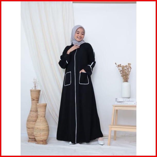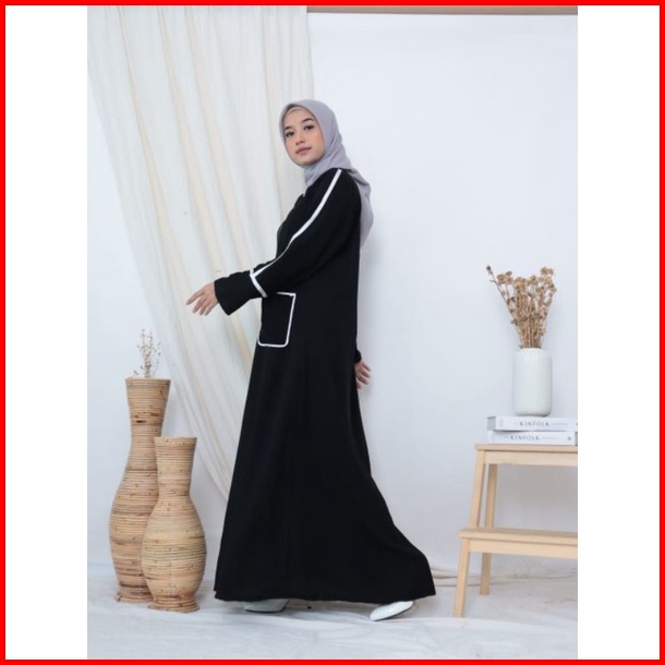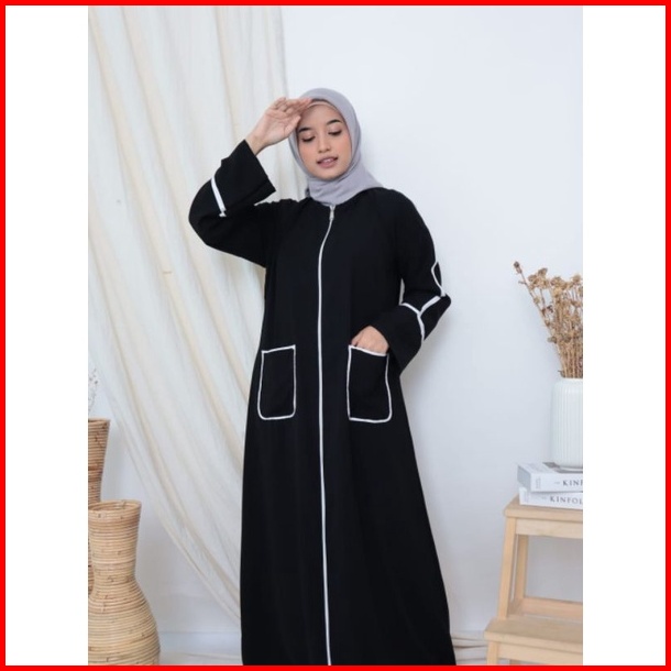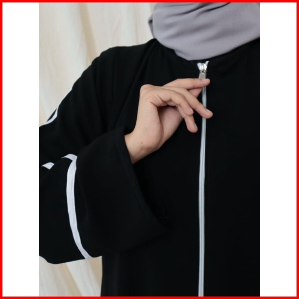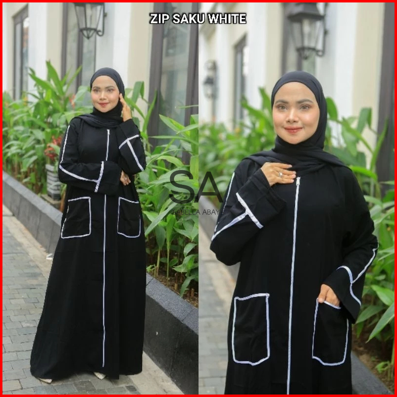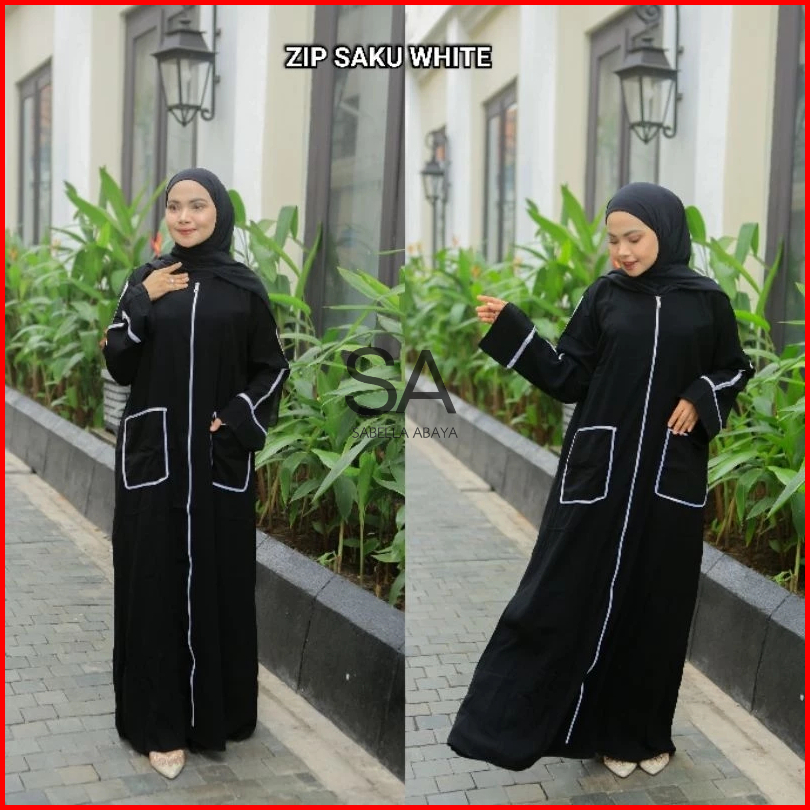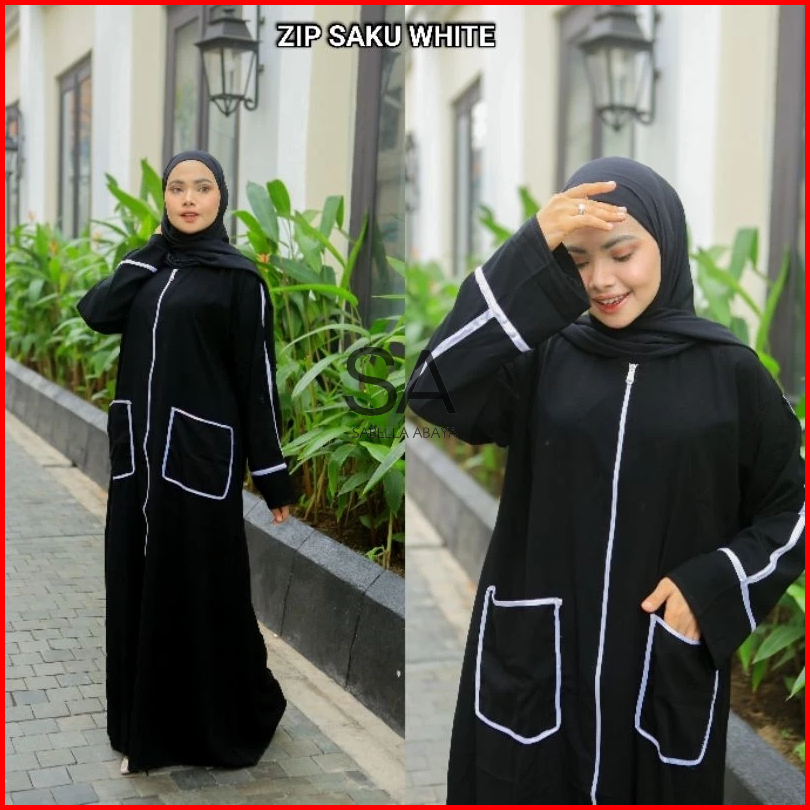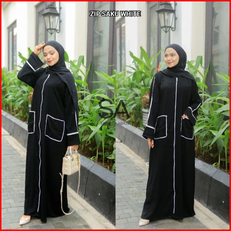 Gamis Hitam Ziper Saku White Casual Daily Wear Sehari-hari By Sabella Abaya