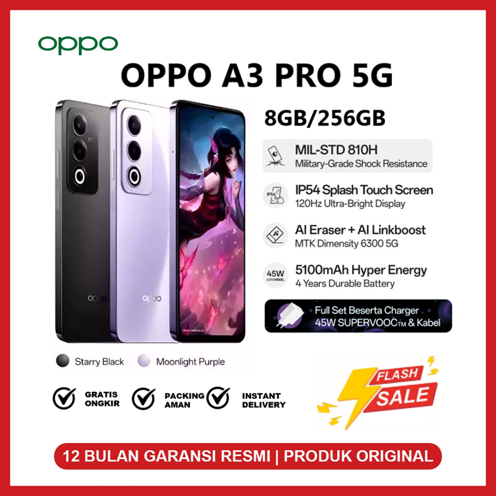HP OPPO A3 PRO 5G 8/256GB GARANSI RESMI NFC MediaTek Dimensity 6300 5100mAh 45W SUPERVOOCTM Kamera utama 50MP