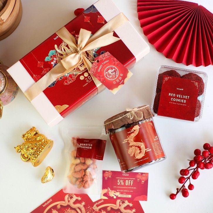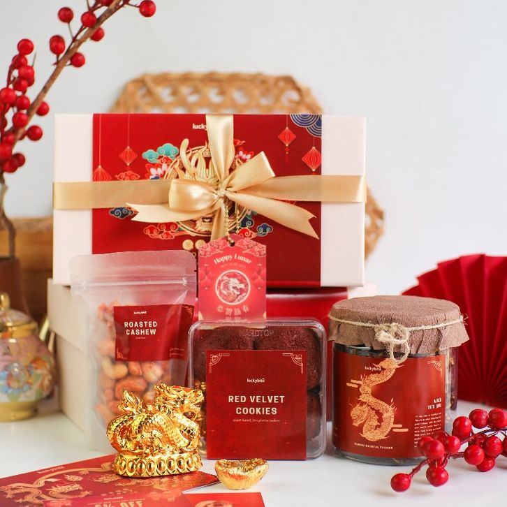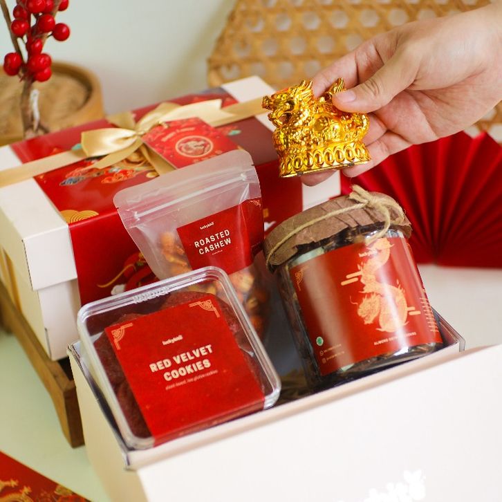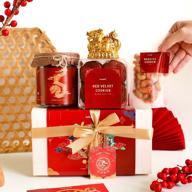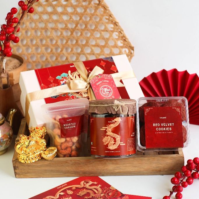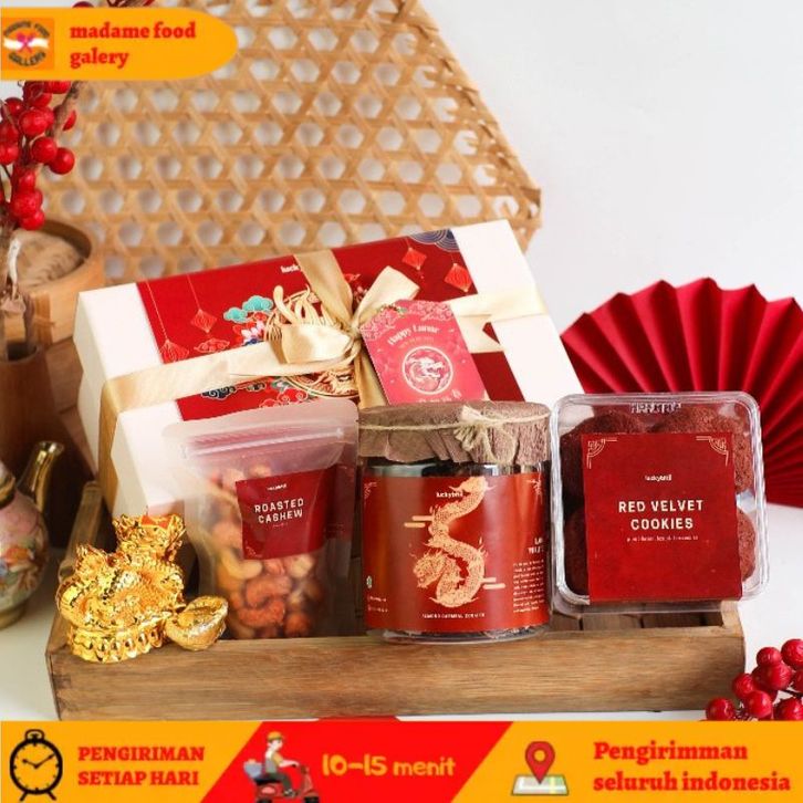Hampers Imlek CNY Hampers Parcel IHampmlek - Semi Hardbox - Oatmeal Cookies Red Velvet Cookies Kacang Mede Miniatur