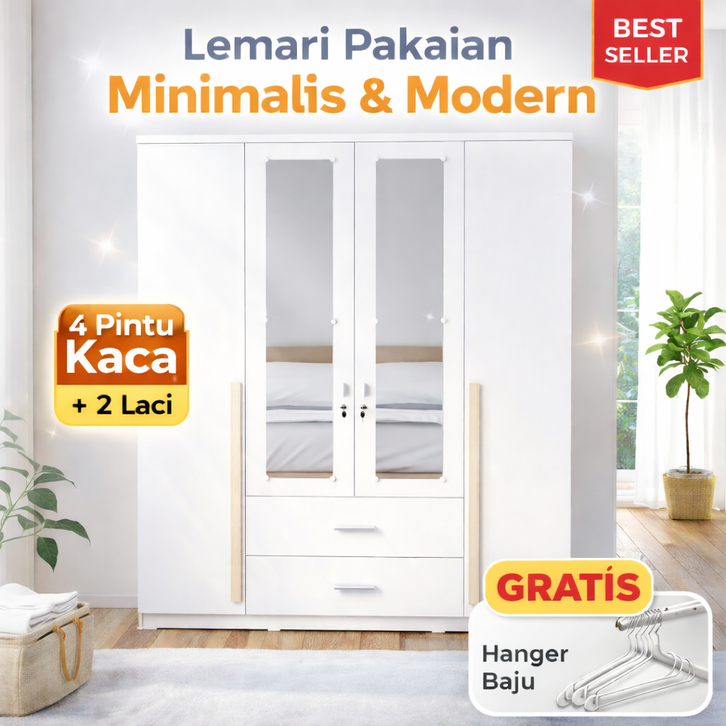 Lemari Pakaian 4 Pintu Kaca Minimalis – Lemari Baju Modern Putih
