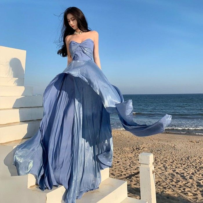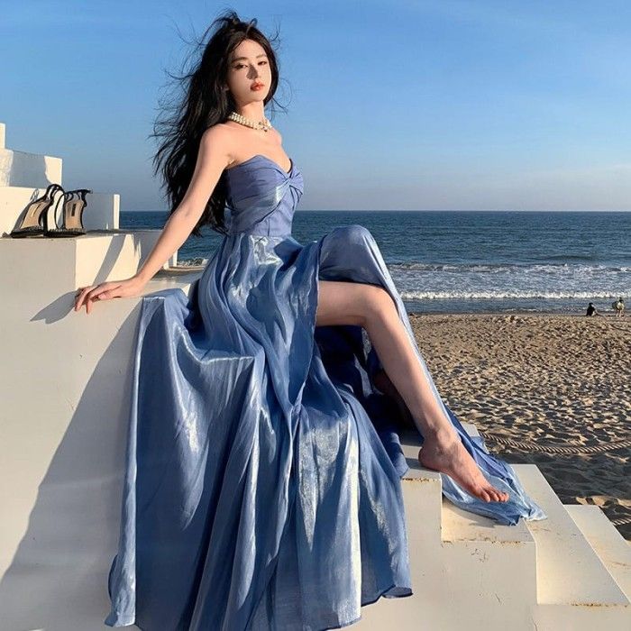 Long Dress blue sateen long dress pesta wanita / dress ulang tahun / dress pantai - S