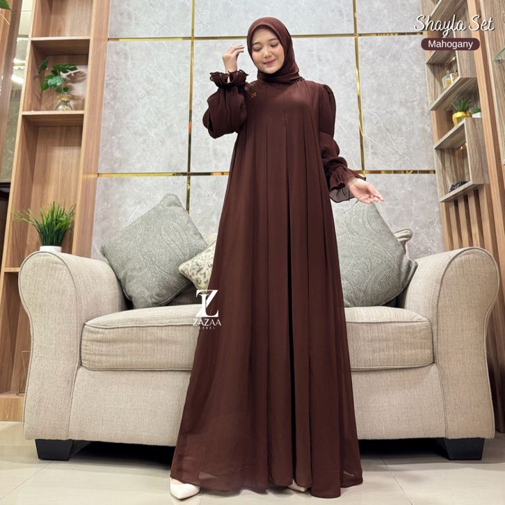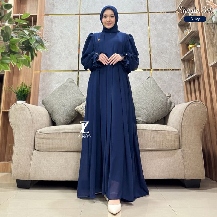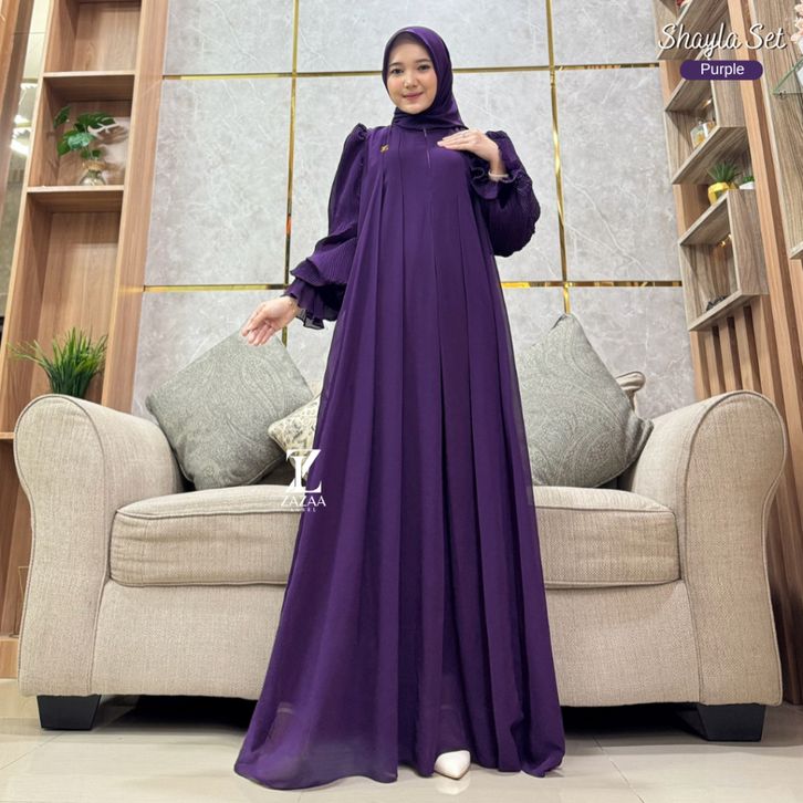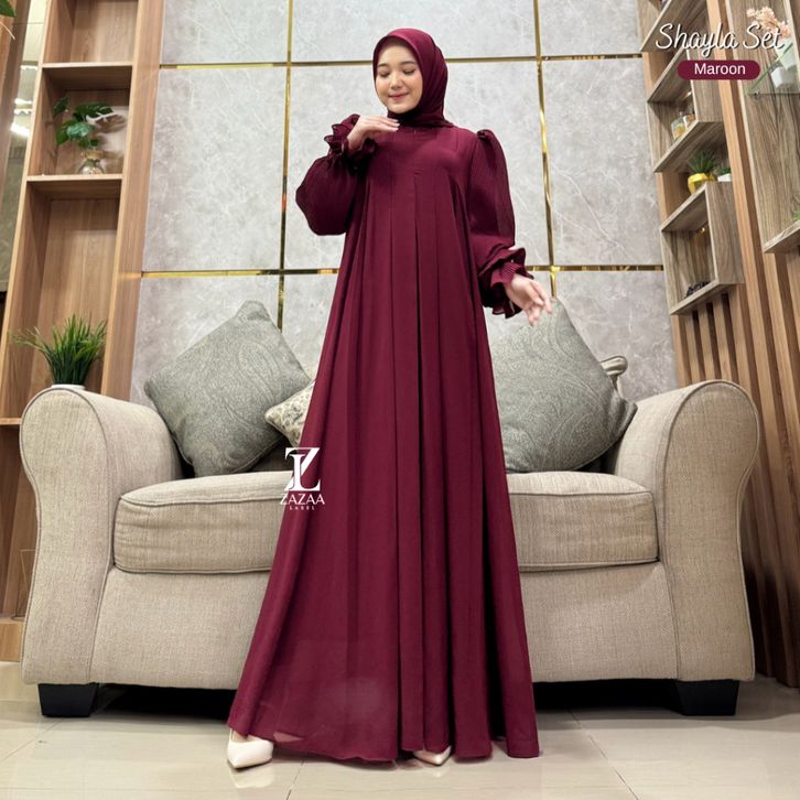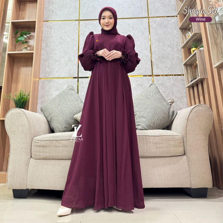 Baju Gamis Set Hijab Ceruty Kombinasi Lengan Plisket Ziper Busui Pesta Mewah Zazaa Label - Shayla