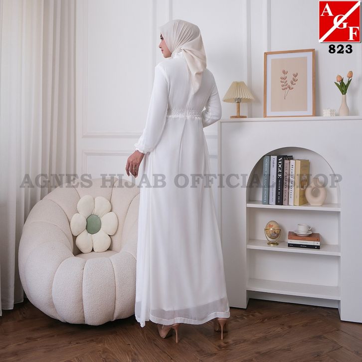 BAJU LEBARAN TERBARU 2025 GAMIS WANITA Agacia Dress Gamis Putih Premium Baju Lebaran 2025 Terbaru Elegan Gaun Pesta Mewa