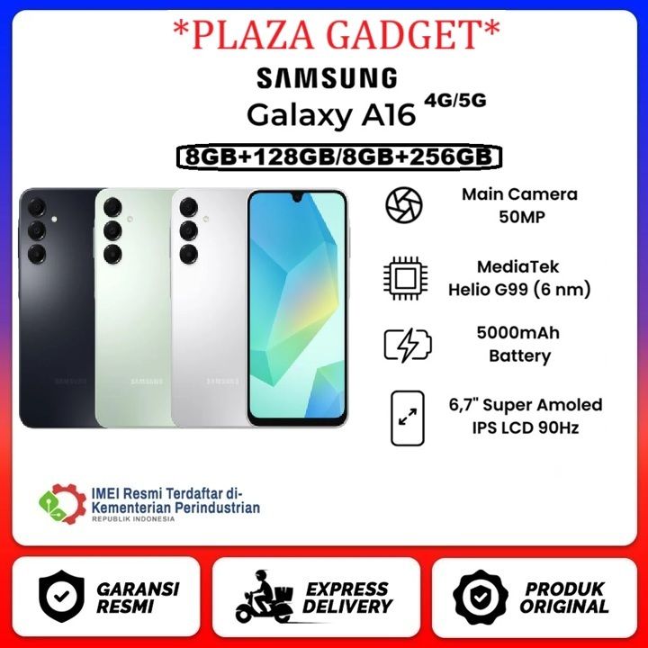 SAMSUNG A16 4G/5G 8/128GB+8/256GB NFC Chipset MediaTek Helio G99 Kapasitas : 5000 mAh Fitur : Pengisian cepat 25W
