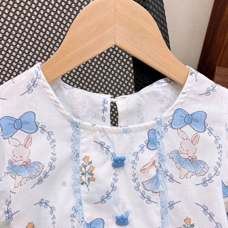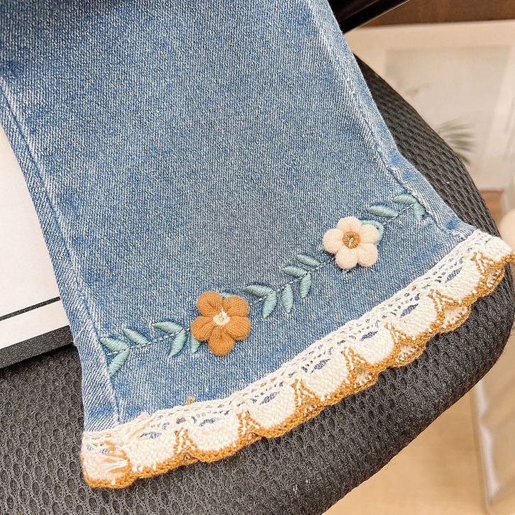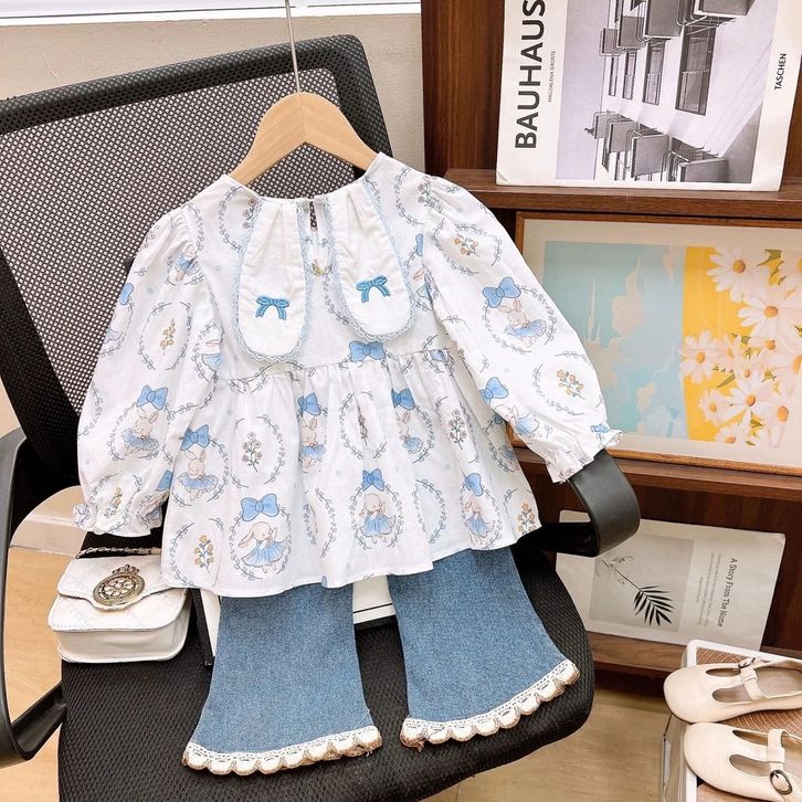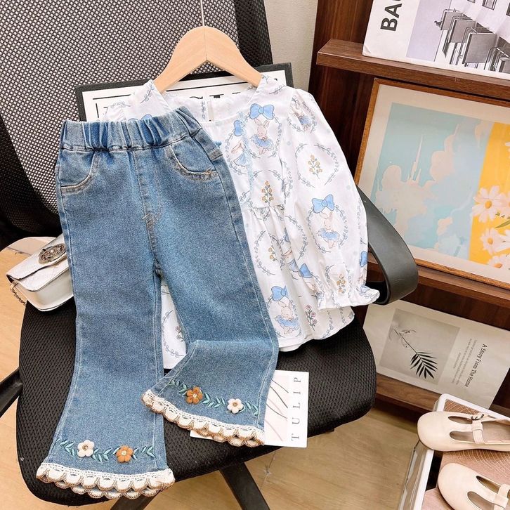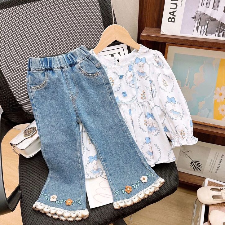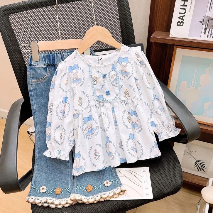 363817 Setelan Baju Blouse Lengan Panjang Bawahan Celana Jeans Panjang Fashion Anak Perempuan Motif Animal Flowers