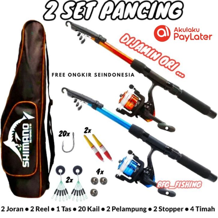 Joran Pancing Reel Pancing Set Lengkap 2 Joran 150cm dan Reel Pancing Biru Merah Plus Tas Bonus Kail Stopper Pelampung T