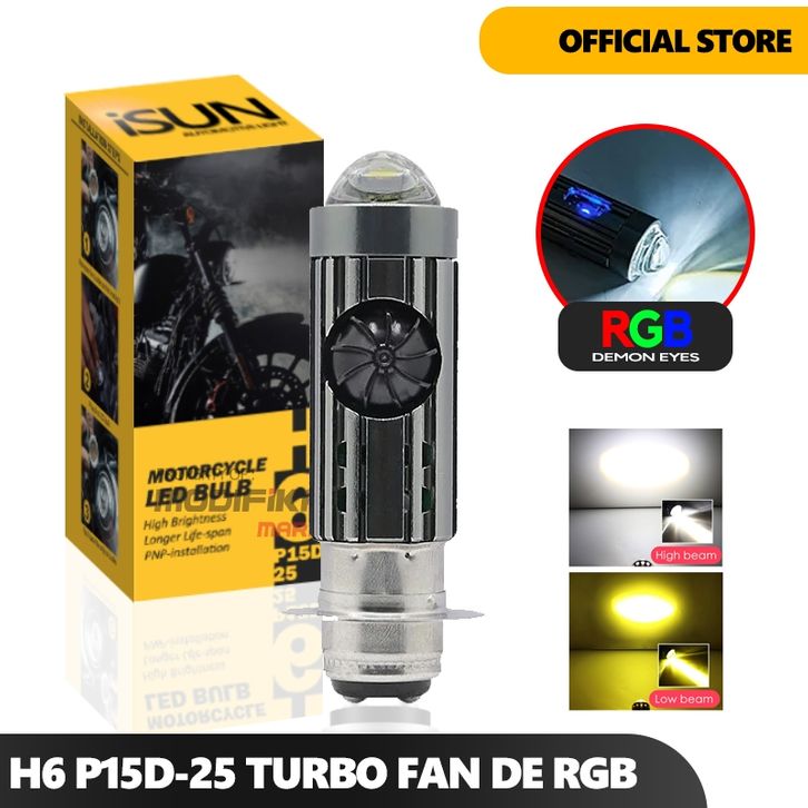 Lampu Utama Motor Bebek Metic Metik Headlamp Laser H6 P15D-25 dengan Kipas dan RGB Devil-Eyes DC9-80V/15W