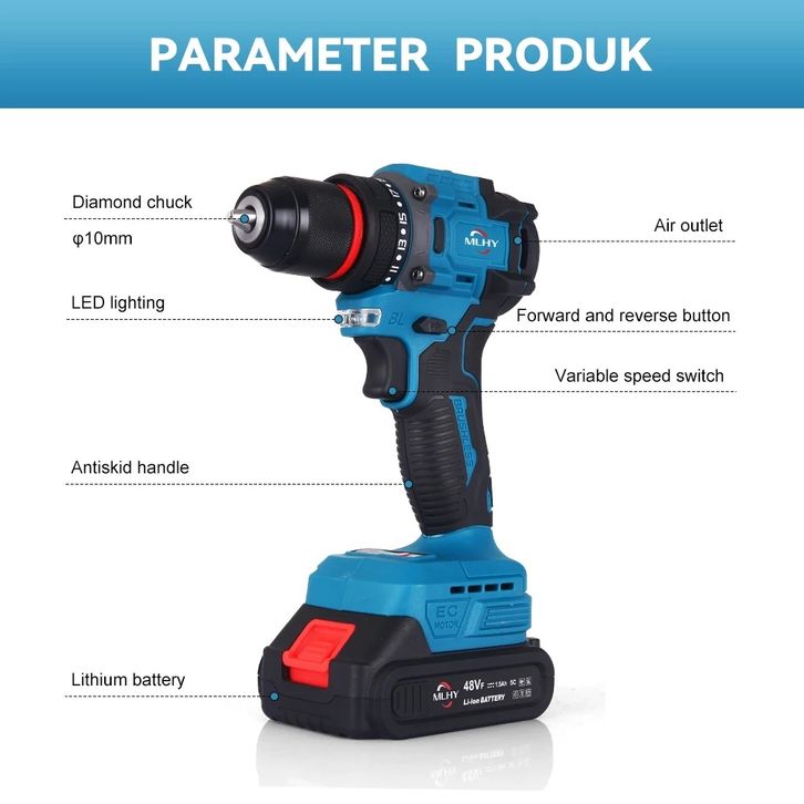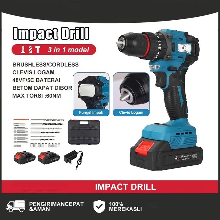 Brushless Mesin lmpact bor Clevis Cordless Drill 60N.M 2Baterai Bisa Bor beton 10mm