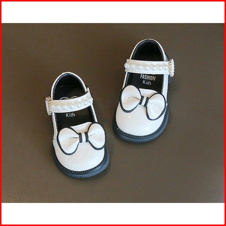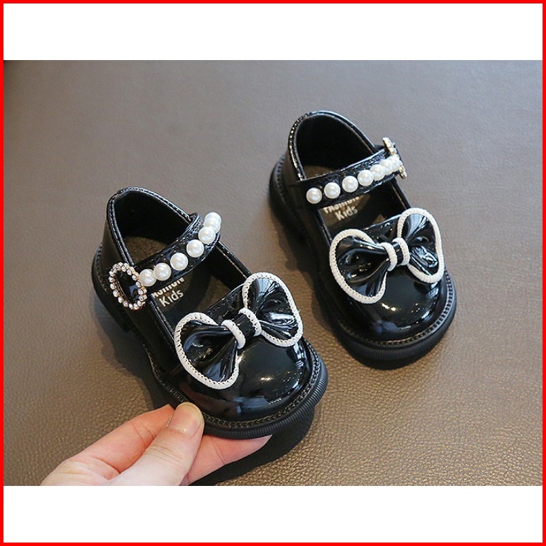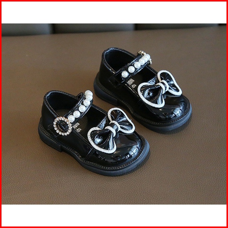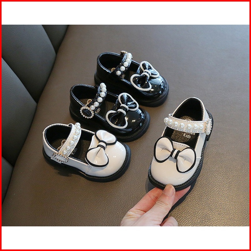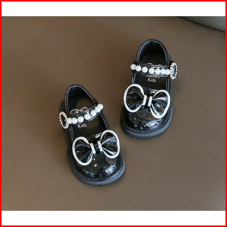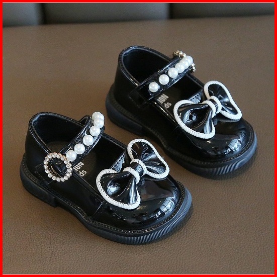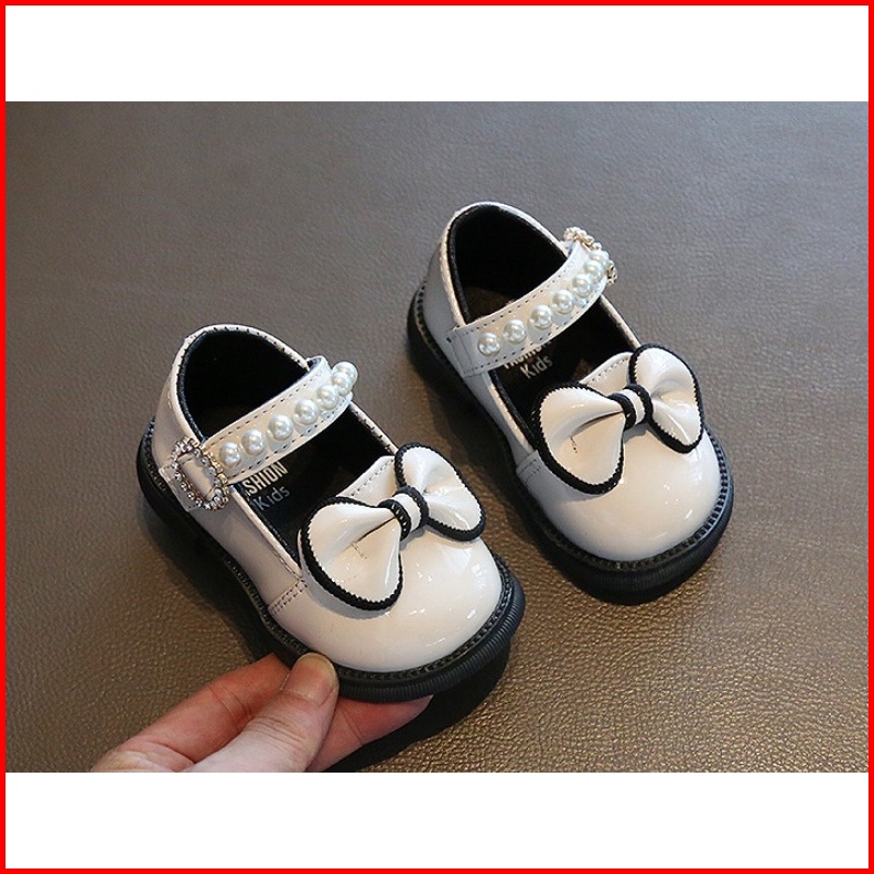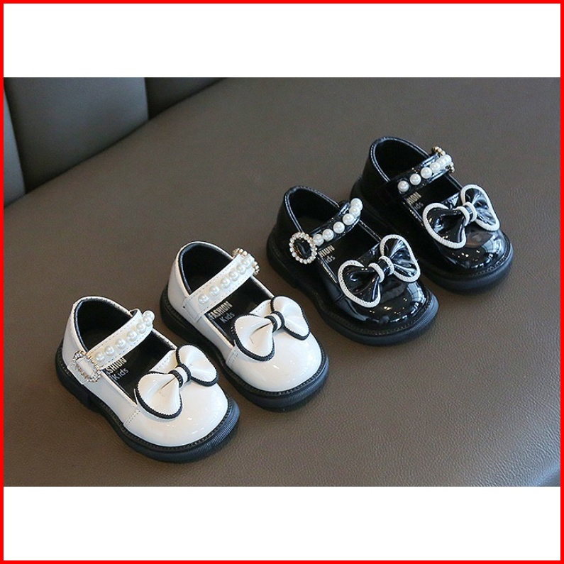 Sepatu Anak Dan Bayi Perempuan Import Premium Motif Pita Cream Hitam Mutiara Premium Lentur