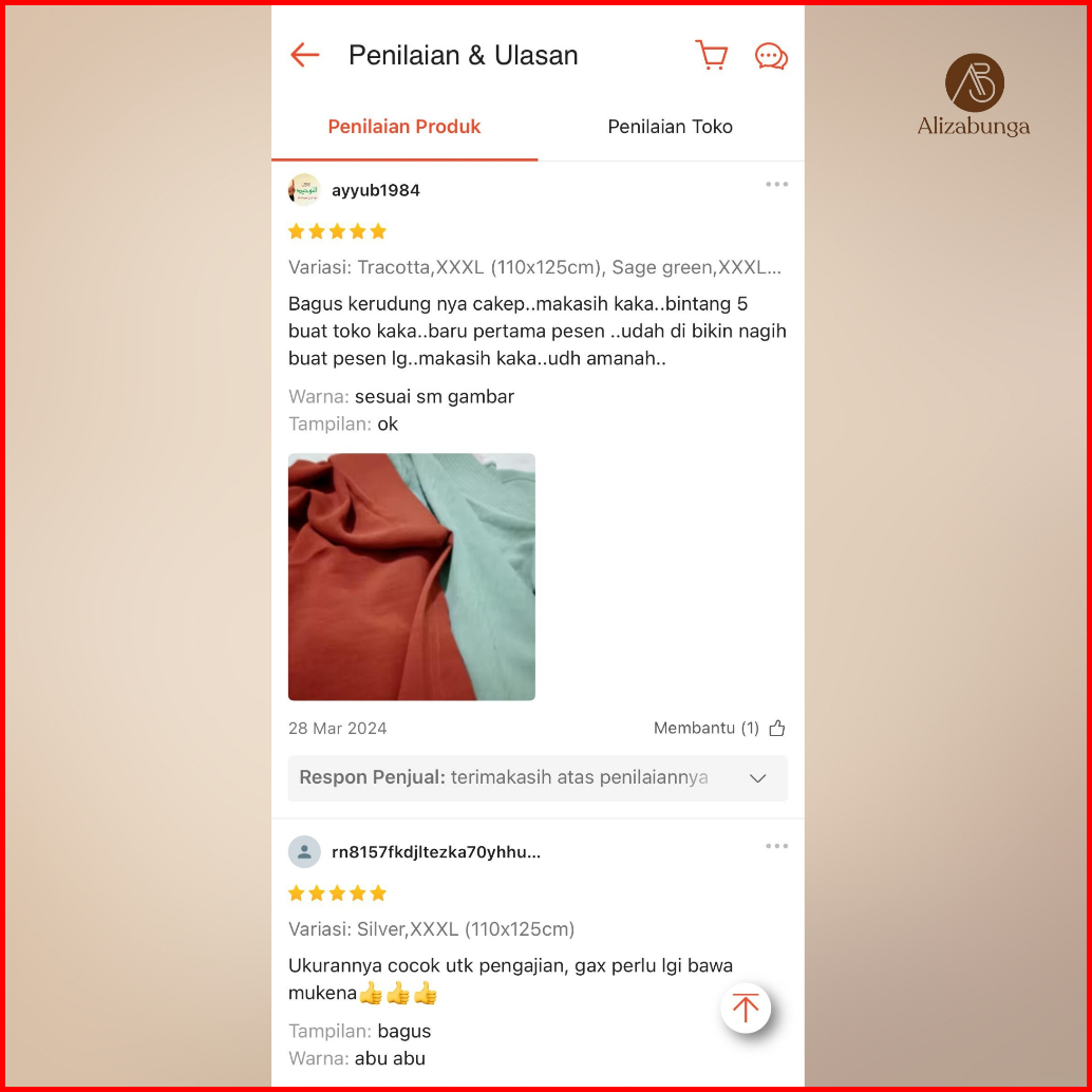 Hitam, Navy, Denim, Biru Wardah, Abu Tua, Coffe, Milo, Mocca, Silver, Stone, Hazelnut, Cream, Salmon, Dusty Pink, dusty dove, Taro, mauve, Burgundy, Maroon, Tembaga, Tracotta, Broken white, Putih Bersih, Mustard, Olive, Lemon, Deep army, Sage green, Hijau Botol