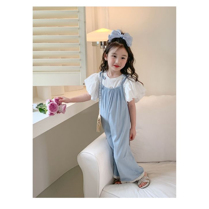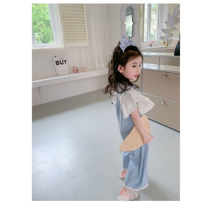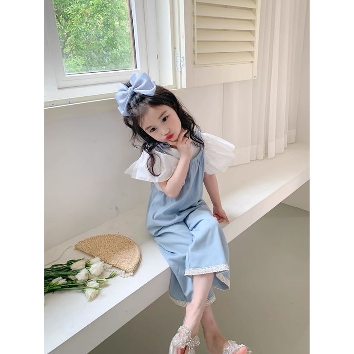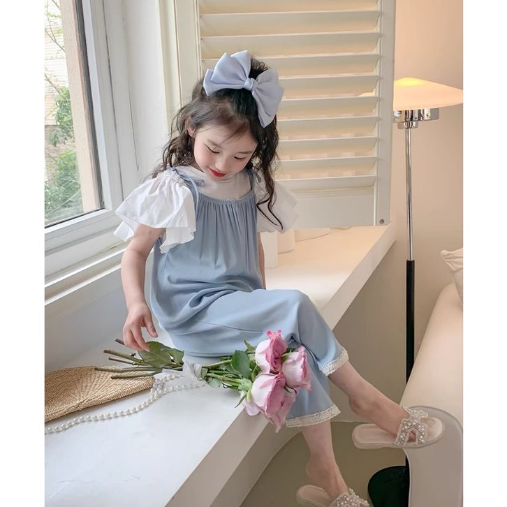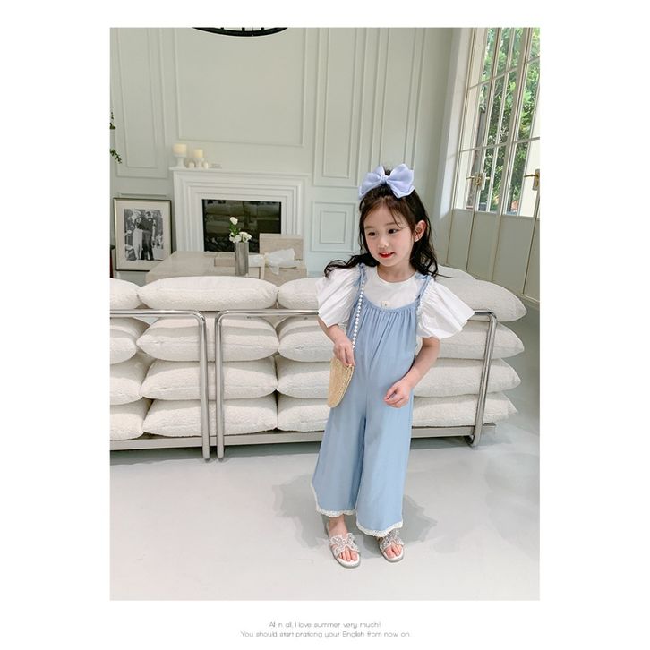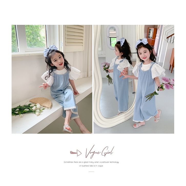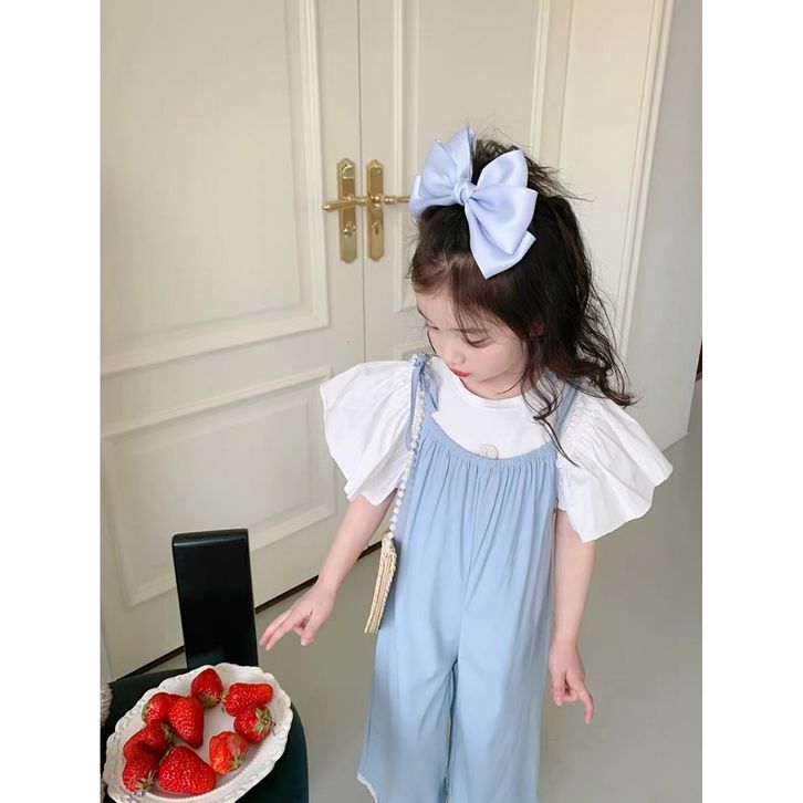 [Star] Setelan Anak Perempuan T-shirt putih dengan lengan terbang yang manis + Celana Panjang Overall biru Baju Anak