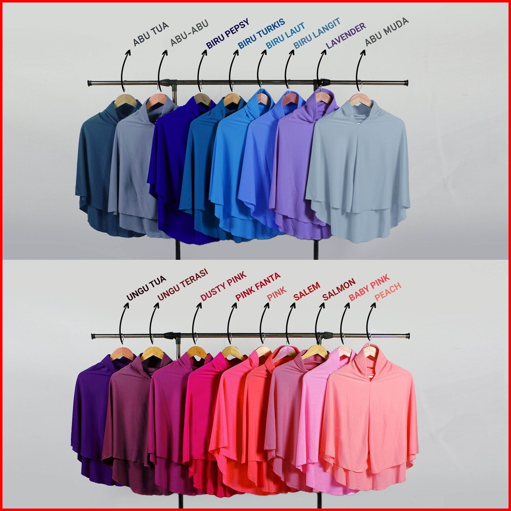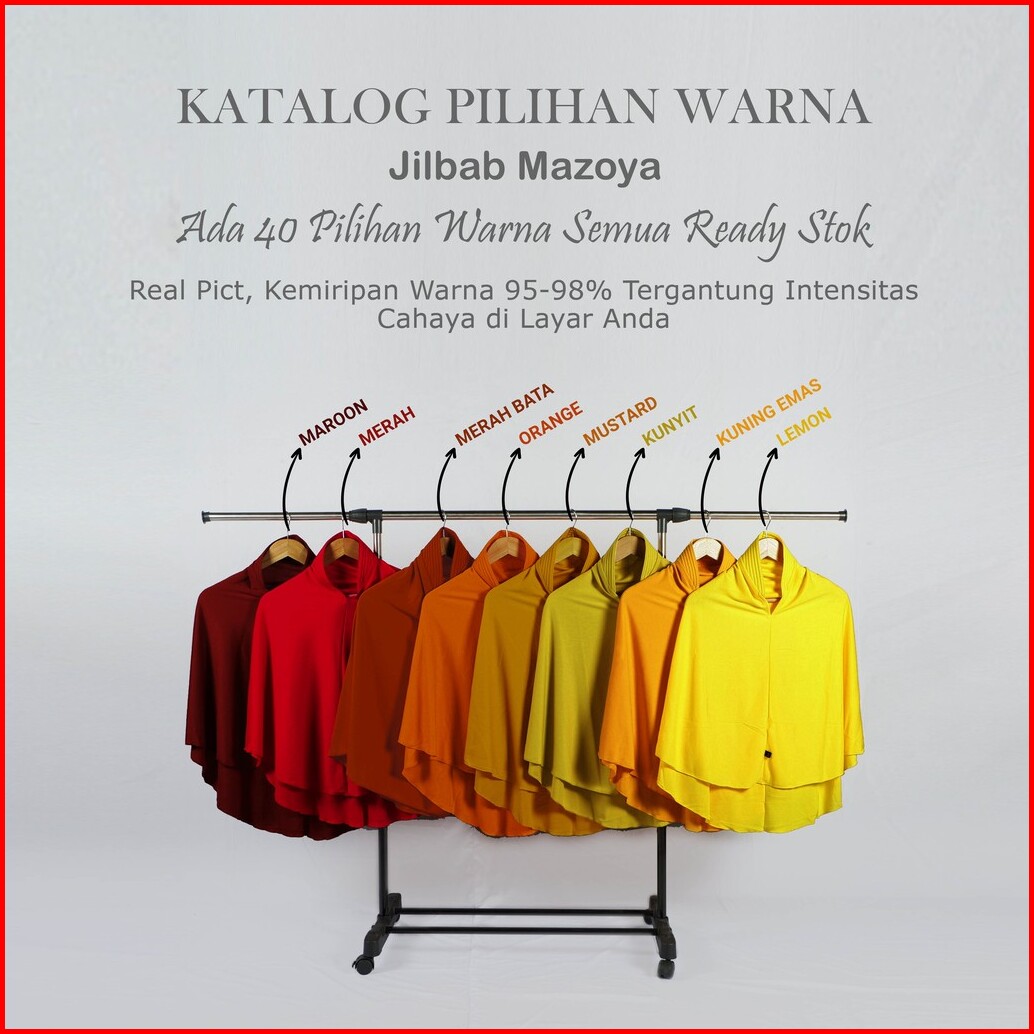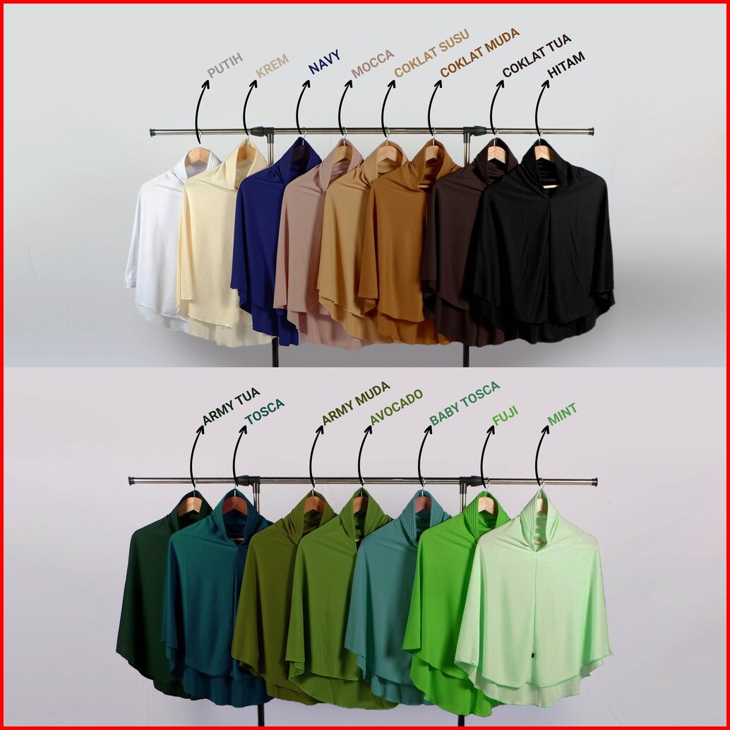 MERAH MARON, Merah, MERAH BATA, ORANGE, Mustard, KUNYIT, KUNING EMAS, LEMON, Abu Tua, Abu-abu, BIRU PEPSY, BIRU TURKIS, BIRU LAUT, BIRU LANGIT, Lavender, ABU MUDA, Ungu Tua, UNGU TERASI, Dusty Pink, PINK FANTA, PINK, SALEM, SALMON, BABY PINK, PEACH, Putih, CREAM, NAVY, MOCCA, COKLAT SUSU, Cokelat Muda, Cokelat Tua, Hitam, ARMY TUA, ARMY MUDA, TOSCA, BABY TOSCA, AVOCADO, FUJI, Mint