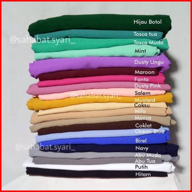 Hitam, Dusty Pink, Putih, Milo, Maroon, Navy, Abu muda, Abu Tua, Cokelat Tua, Coklat susu, Hijau Botol, Mustard, Lavender, Hijau Tua