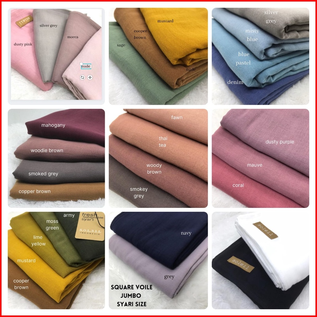 Hitam, 💕Sage⭐⭐⭐⭐⭐, Putih, Grey, Moss Green, Mocca, Silver Grey, Coral Pink, Smoked Grey, Navy blue, Lavender/Lilac, Mustard, Mahagony-marun gelap, Camel / coksu, Woodie Brown, Copper brown, Pastel Blue, Misty Blue, Mauve, Iced blue, Dark Purple, Denim, Nude Pink, Dusty purple, Dusty Pink, Merah, Khaki, Marun, Taupe, Hare, Musk, Thai Tea, Nude/kulit, Dusky Rose, Abu Tua