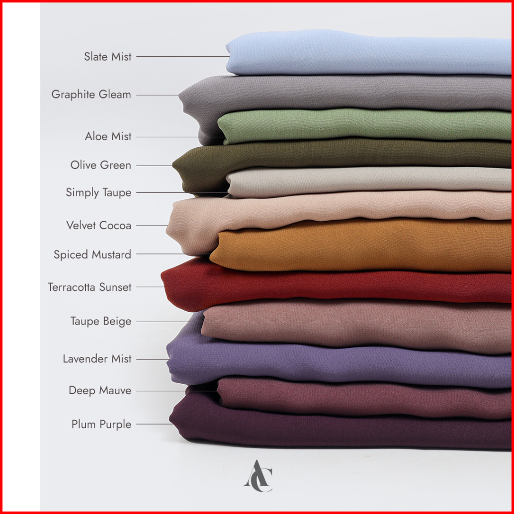 Bitter Chocolate, Cocoa, Demilasse, Formal Black, Dark Denim, Dark Grey, Dark Maroon, Chocomilk, Cotton, Dark Cherry, Fawn, Quail, Rose Taupe, Aloe Mist, Graphite Gleam, Simply Taupe, Velvet Cocoa, Olive Green, Spiced Mustard, Terracotta Sunset, Taupe Beige, Lavender Mist, Deep Mauve, Plum Purple, Cocoa Bean, Dark Onyx Green, Eucalyptus, Evergreen, Midnight Blue, Military Olive, Rose Quartz, Sapphire Dusk, Charcoal, Wild Ginger, Moonscape, Seneca Rock, Deep Teal, Crown Blue, Xanadu, Vintage Rose, Royal Blue, Raisin, Pigeon Blue, Lava Grey, Dusty Rose, Dark Purple
