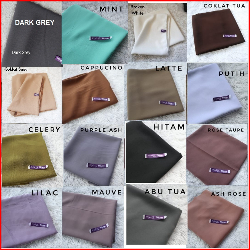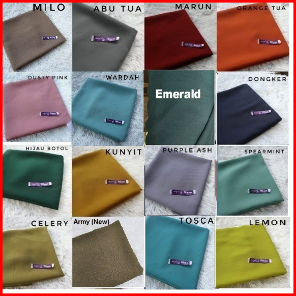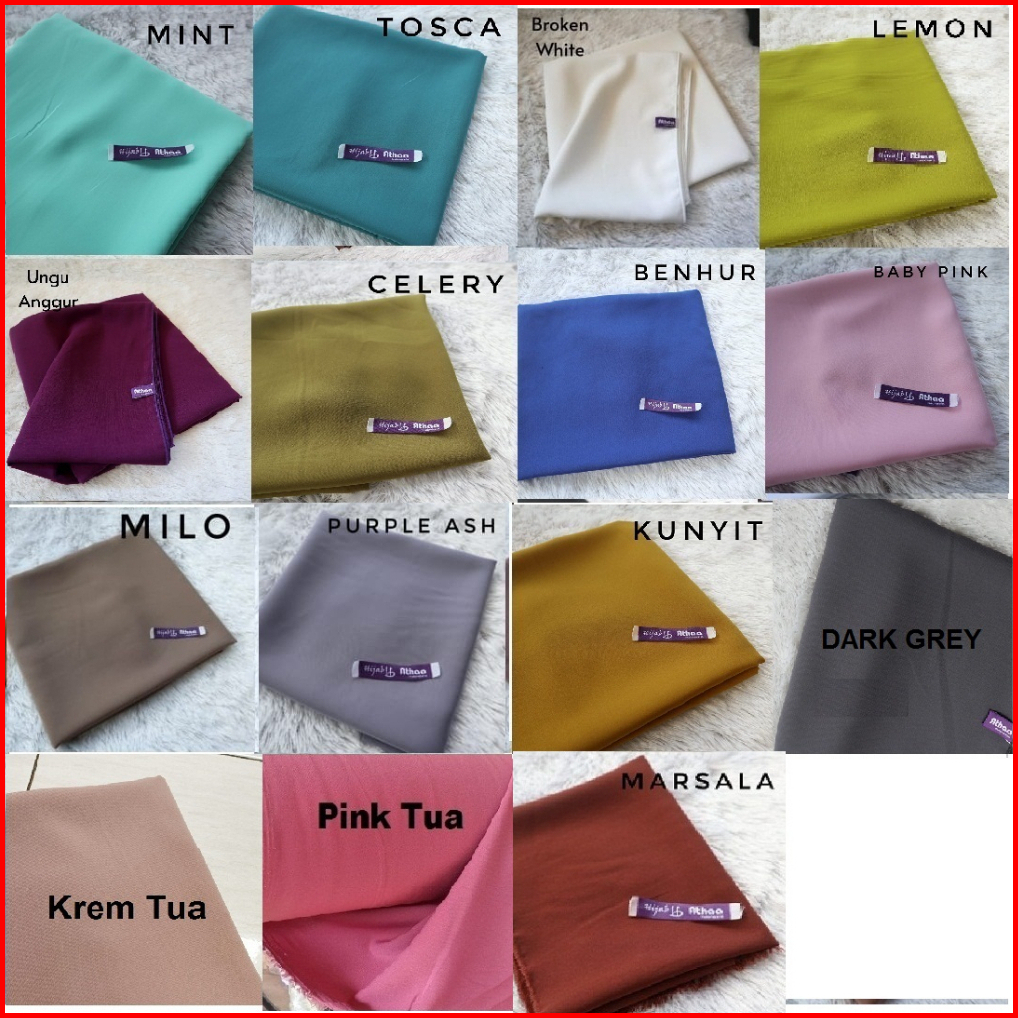 HITAM, Abu Muda, Abu Tua, Dark Grey/ Abu Gelap, Ash Rose, Baby Pink, Army (new), Benhur, Cappucino, Celery, Coklat Tua, Coklat Susu, Dusty Pink, Emerald, Hotchoco, Hijau Botol, Krem, Krem Tua, Kunyit, Lilac, Lemon, Mauve, Marsala, Marun, Merah Bendera, Mint Green, Mint, Milo, Orange Tua, Putih, Pink Lavender, Pink Tua, Petrol Blue, Rose Taupe, Spearmint, Wardah, Tosca, Ungu Anggur, Orchid, Caramel, Biru Langit, Hijau Sage, Purple Ash, Hazelnut, Latte, Putih Tulang, Dongker/Navy, Denim, Biru Elektrik, Biru Muda