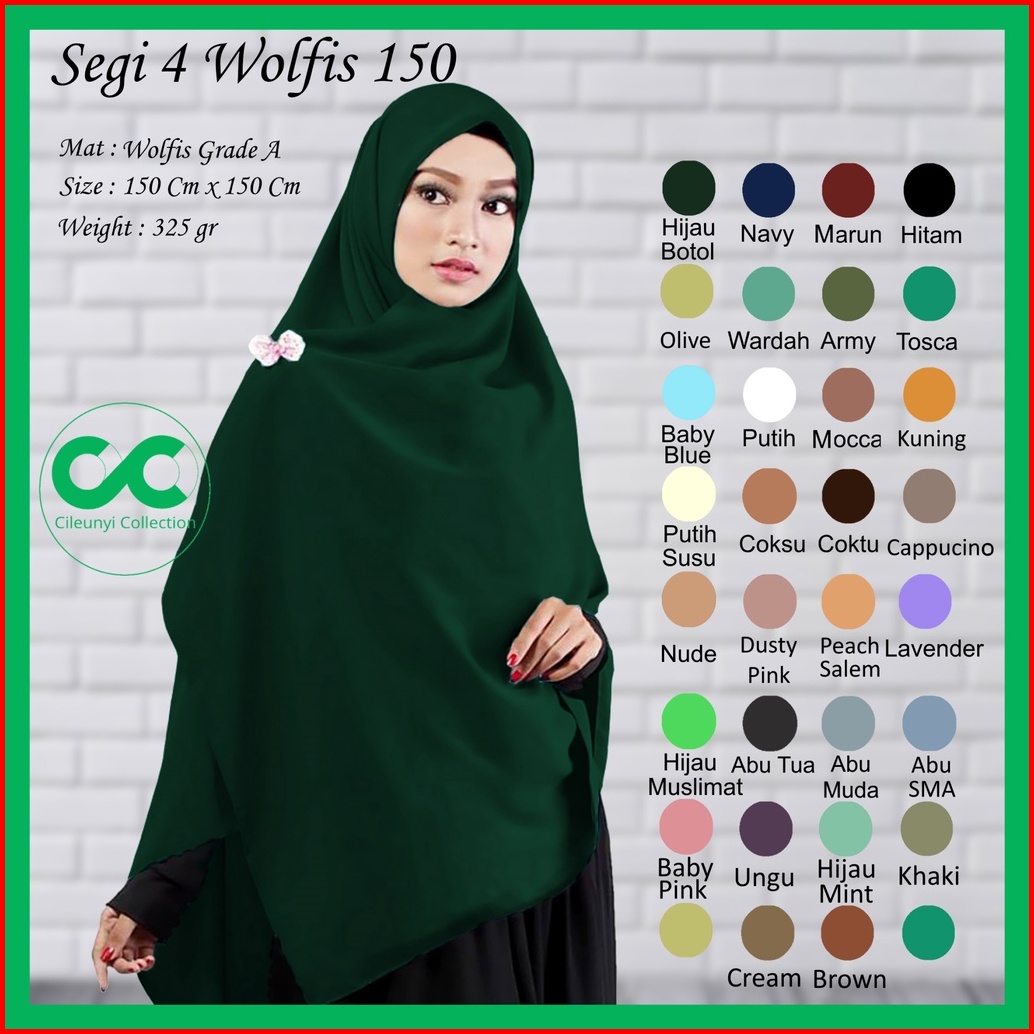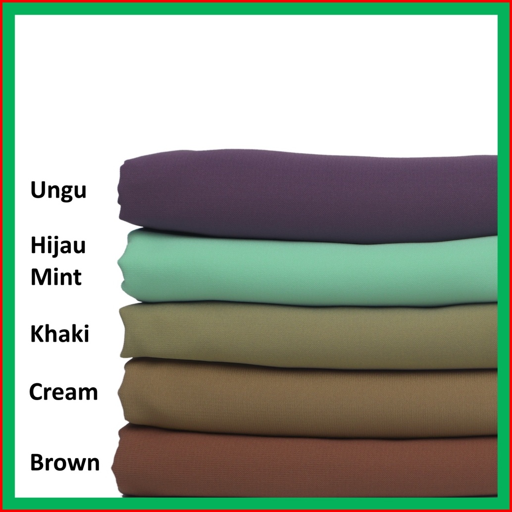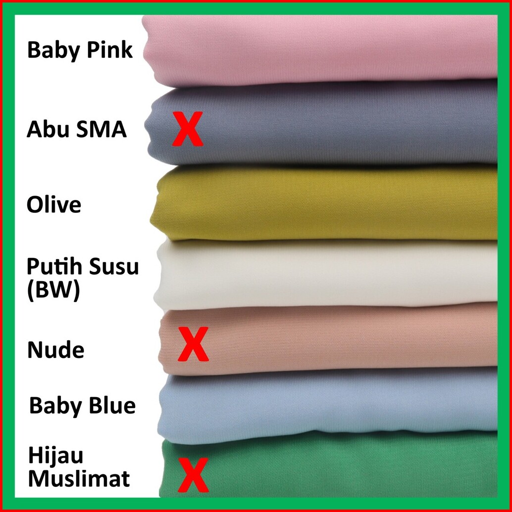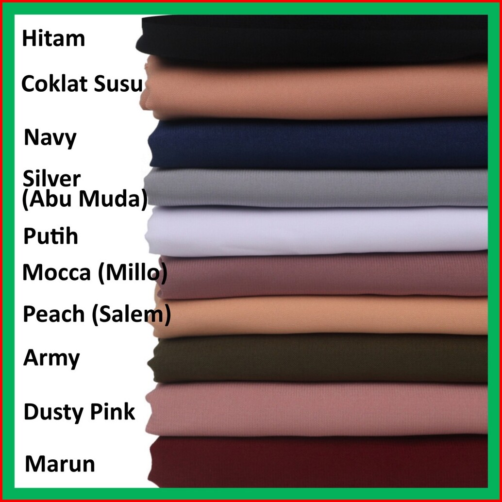 Hitam, Putih, Coklat Tua (Cokpi), Navy, Abu SMA, Abu Tua, Army, Baby Blue, Baby Pink, Beige, Biru BCA, Biru Turkish, Brown, Cappucino, Coklat Susu (Coksu), Coklat Tanah, Cream, Cream Muda, Charcoal, Darwin, Denim, Dove, Dusty Pink, Fanta, Frappucino, Gold (Kubus), Grey, Hazelnut, Hijau Botol, Hijau Muslimat, Hijau Super, Hijau Tosca, Hijau Wardah, Khaki, Lavender, Marun, Matcha, Merah Cabe, Mint, Mocca (Milo), Nude, Olive, Peach (Salem), Salem Merah, Putih Susu (BW), Rose Pink, Silver (Abu Muda), Ungu, Ungu Tua, Velimilo