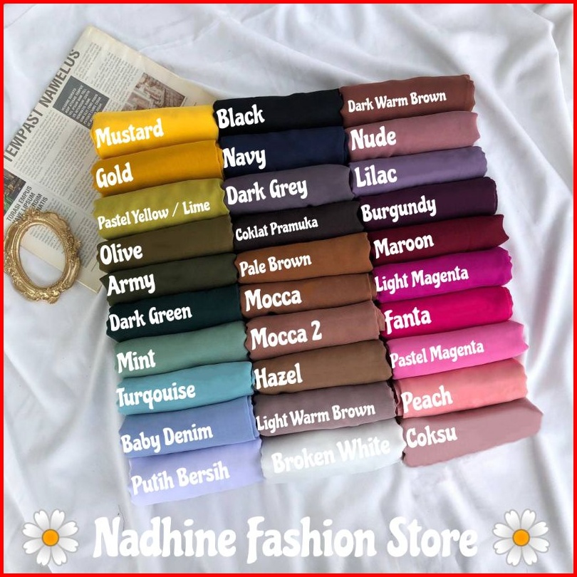 DARK WARM BROWN, LIGHT WARM BROWN, PALE BROWN, PASTEL MAGENTA, PEACH, PASTEL MAGENTA RED, DARK VIOLET, BURGUNDY, TURQOUISE, BLUE, BIRU BCA, NAVY, GOLD, GREY, GREY PASTEL, DARK SILVER, HITAM, ARMY, DARK GREEN / EMERALD, TOSCA, PASTEL GREEN CYAN, PASTEL YELLOW, NUDE, ORANGE PKS, PUTIH BERSIH, ROSE PINK, DUSTY PINK, SOFT PURPLE, SAGE, LAVENDER, KHAKI, LUMUT, BLUE VIOLET, RED (MERAH CABE), SOFT YELLOW, LIGHT BLUE, VIOLET MAGENTA, LILAC, BABY MINT, WARM WHITE, CHOCOMILK, BRICK / BATTA, LIGHT PEA GREEN, MUSTARD, OLIVE, COKLAT PRAMUKA, PINK, BROKEN WHITE, MAROON, LIGHT MAGENTA, SALEM, BROWN, MERAH MANGGIS