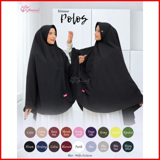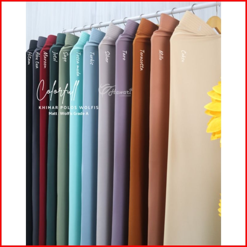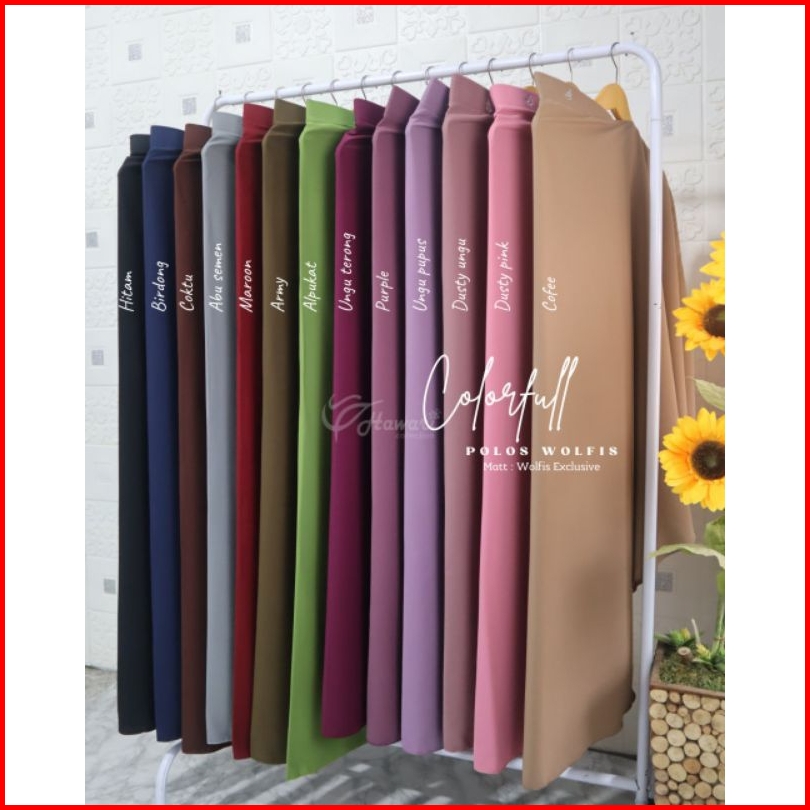 Hitam Jett black, Marun, Alpukat, Ungu pupus, Birdong, Ungu tua, Putih, Birtos, Sage, Abu tua 02, Silver, Toska muda, Toska, Ungu terong, Silver 02, Moca, Taupe, Smoke grey, Cub, Blue sky, Scarlet brick, Coktu, Hitam, Pink, Dusty pink, Coksu rijek noda, Coksu tua, Army, Hijau pupus, Abu sedang, Purple, Abu semen, Abu