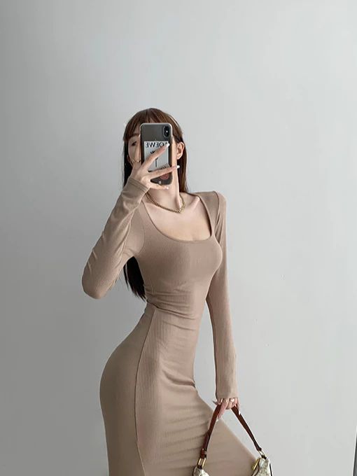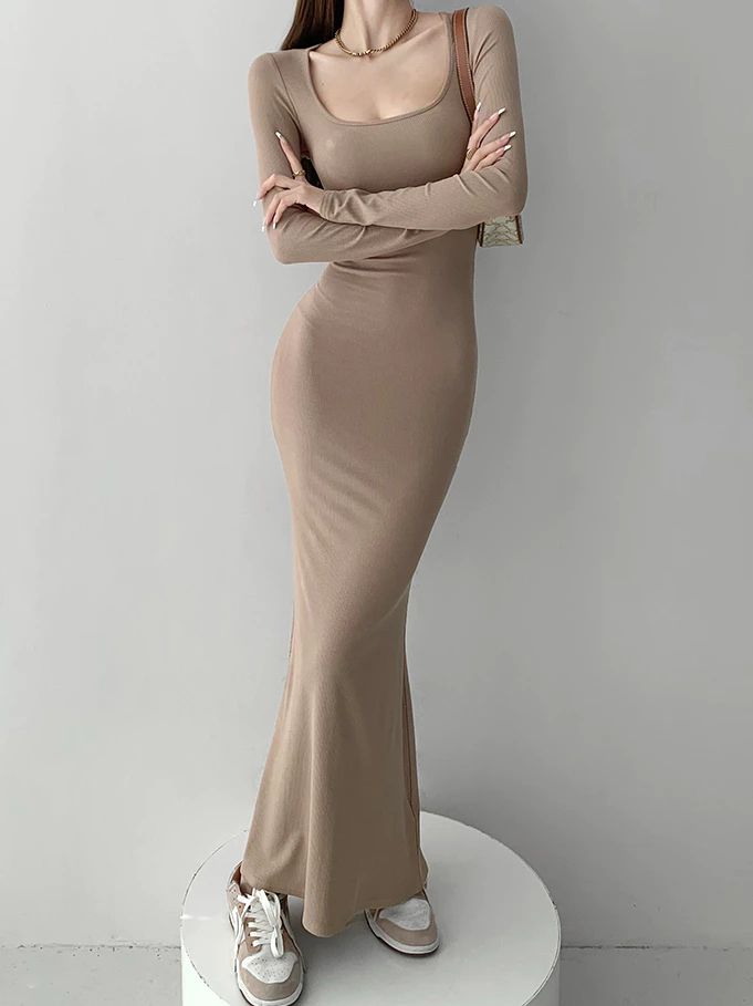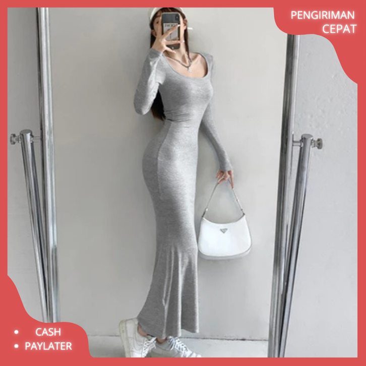 Long Dress Bodycon Plain Long Sleeve Square Neck 3282 S/M/L/XL Dress Long Virall Terbaru Terlaris