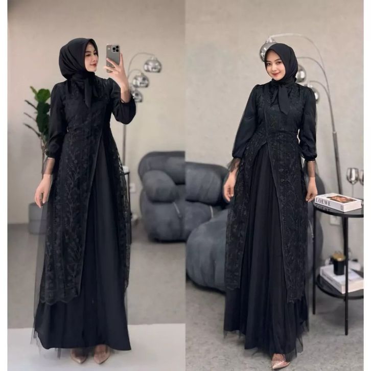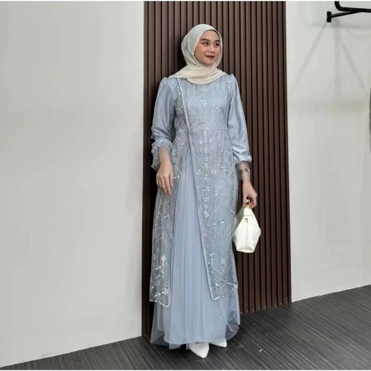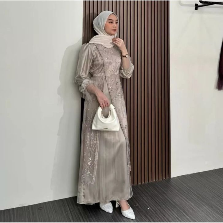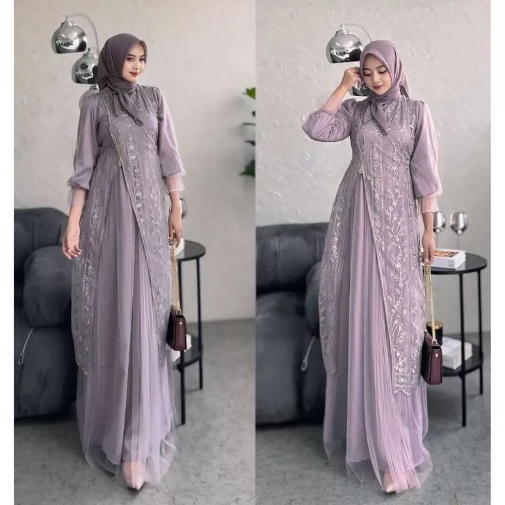 Kinar Dress Silk Kombinasi Tile Garden Premium Warna Burgundy Gamis Brukat Tile Pesta Wanita Mewah