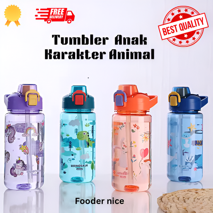 Botol Minum Anak Karakter Animal Lucu Kapasitas 600ml BPA Free Lengkap Tali & Sedotan